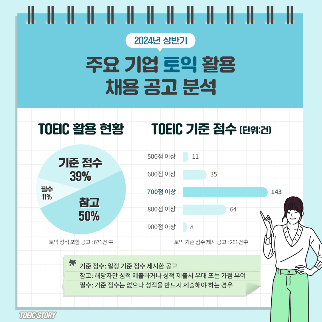 여름의 무더위가 지나고, 어느덧 하반기 채용 시즌이 시작됐습니다. 많은 취준생 분들이 주요 기업에서 어떻게 토익, 토익스피킹을 활용하고 있는지 궁금해하실 것 같은데요. 이에, <토익스토리>는 2024년 상반기 채용(1월~7월)을 진행한 주요 기업의 채용 공고 808건의 토익&토익스피킹을 활용 현황을 정리해 봤습니다. 함께 살펴보시죠!