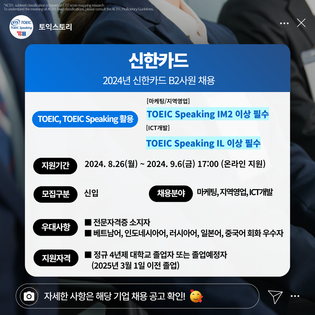 | 신한카드 | 신입 | 2024년 신한카드 B2사원 채용 | 9.6(금) 17:00 | [마케팅/지역영업] TOEIC Speaking IM2 이상 필수 [ICT개발] TOEIC Speaking IL 이상 필수 |
