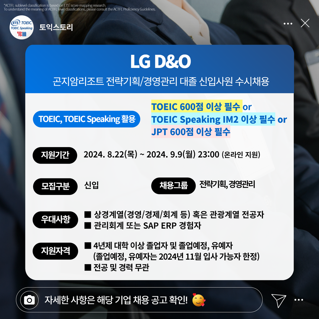 | LG D&O | 신입 | 곤지암리조트 전략기획/경영관리 대졸 신입사원 수시채용 | 9.9(월) 23:00 | TOEIC 600점 이상 필수 or TOEIC Speaking IM2 이상 필수 or JPT 600점 이상 필수 |