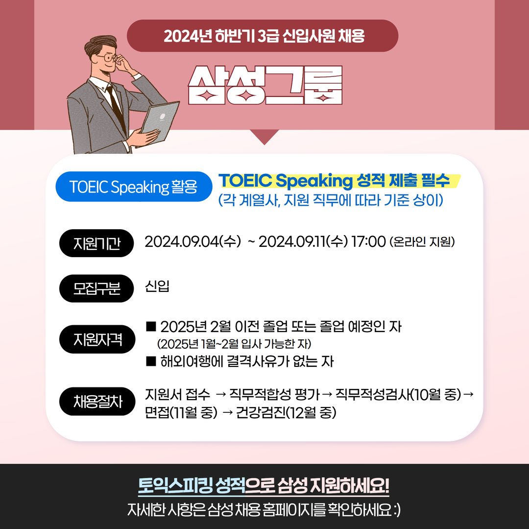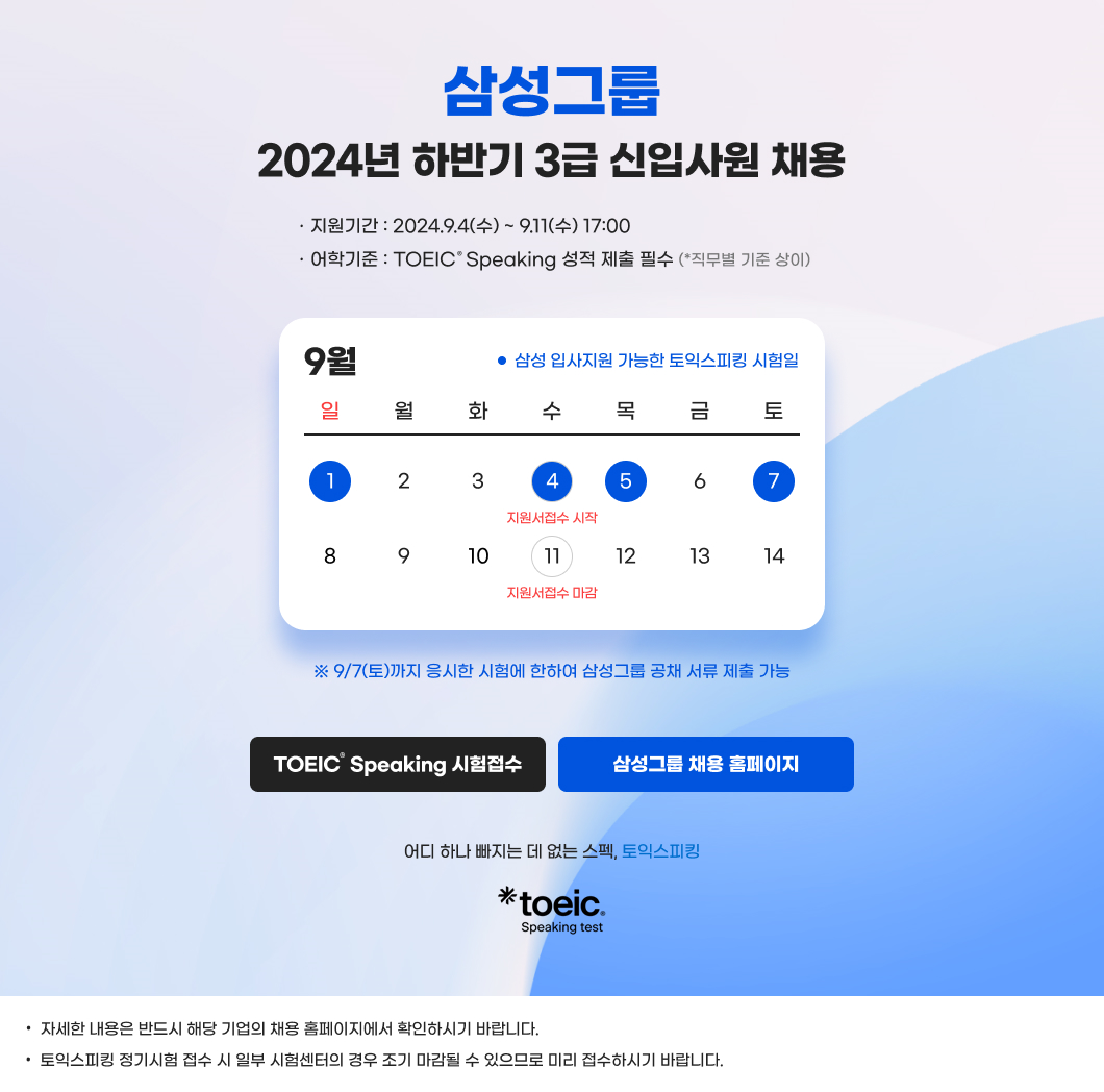 | 삼성그룹 | 신입 | 2024년 하반기 3급 신입사원 채용 공고 | 9.11(수) 17:00 | TOEIC Speaking 성적 제출 필수 (각 계열사, 직무에 따라 기준 상이) |