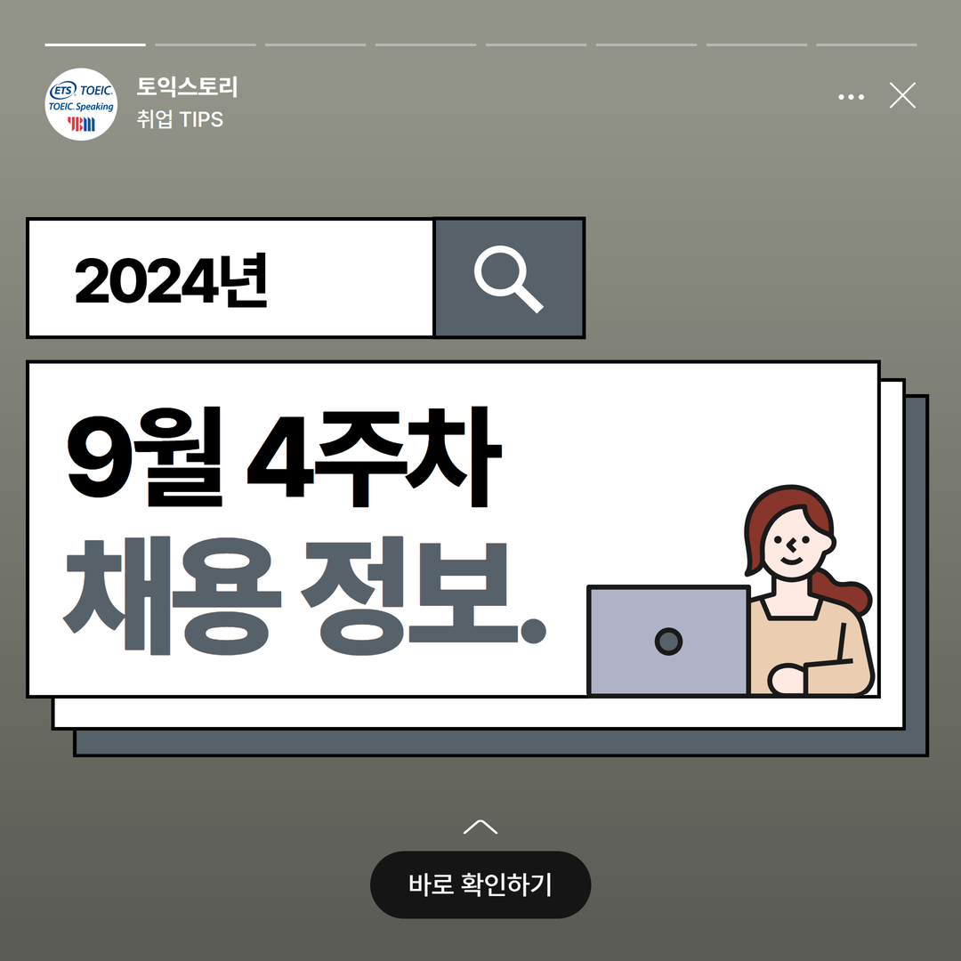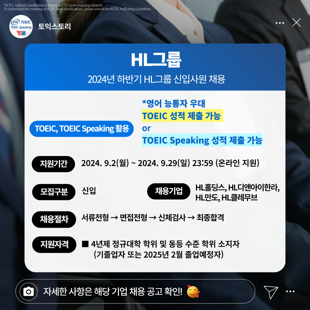 | HL그룹 | 신입 | 2024 하반기 HL그룹 신입사원 채용 | 9.29(일) 23:59 | *영어 능통자 우대 TOEIC 성적 제출 가능 or TOEIC Speaking 성적 제출 가능 |
