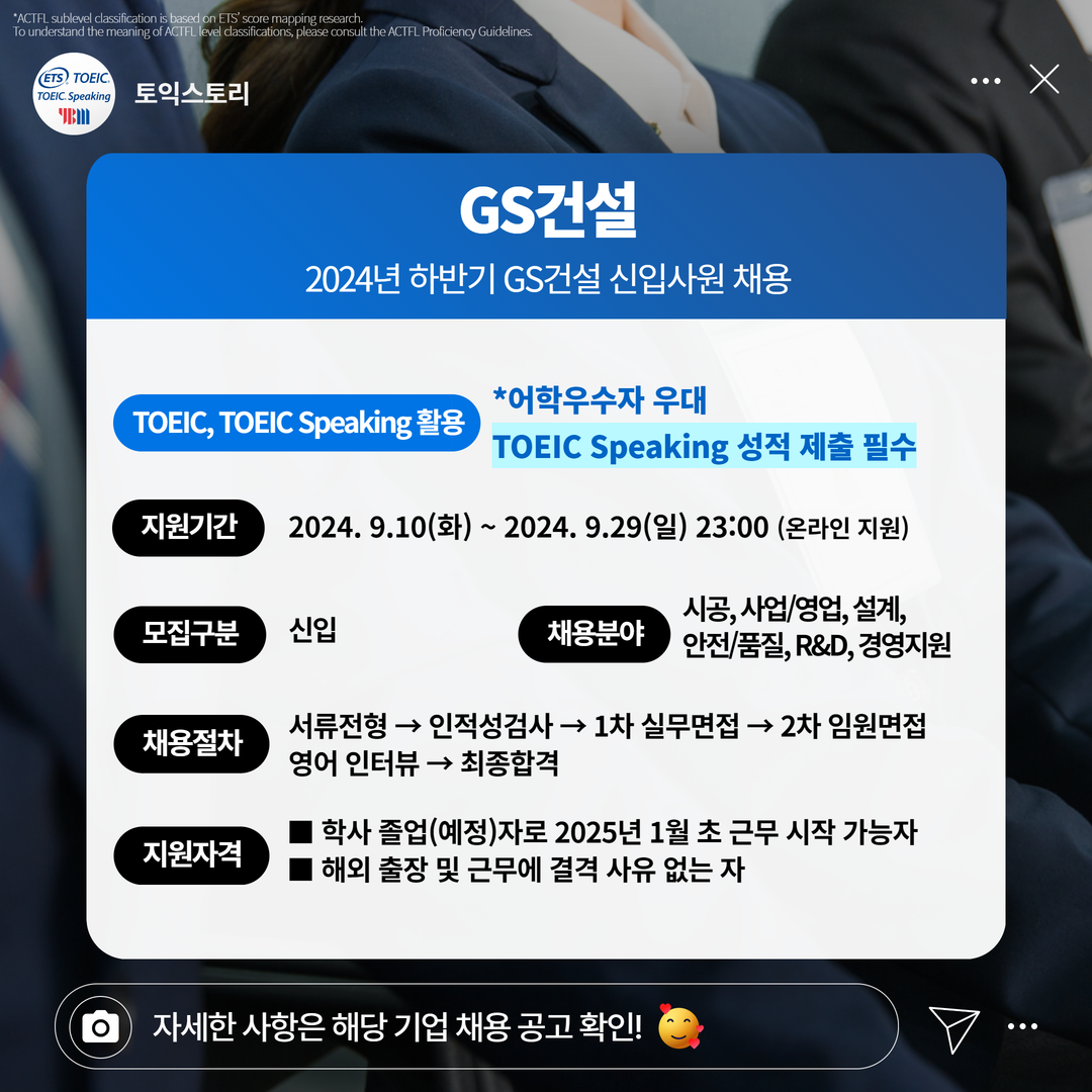 | GS건설 | 신입 | 2024년 하반기 GS건설 신입사원 채용 | 9.29(일) 23:00 | *어학 우수자 우대 TOEIC Speaking 성적 제출 필수 |