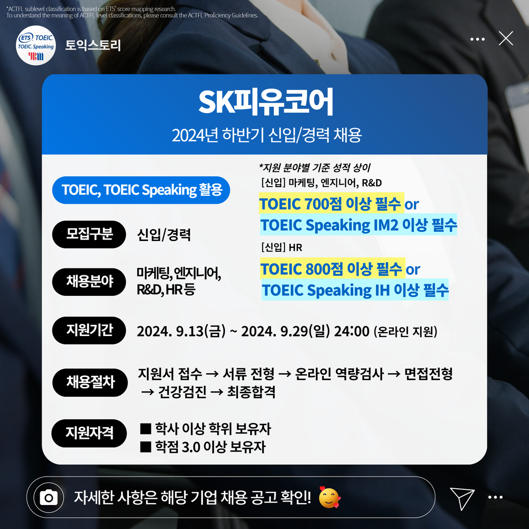 | SK피유코어 | 신입/경력 | SK피유코어 2024년 하반기 신입/경력 채용 | 9.29(일) 24:00 | *지원 분야별 기준 성적 상이 [신입] - 마케팅, 엔지니어, R&D TOEIC 700점 이상 필수 or TOEIC Speaking IM2 이상 필수 - HR TOEIC 800점 이상 필수 or TOEIC Speaking IH 이상 필수 |