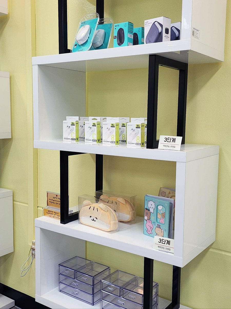 스마트폰 거치대, 탁상거울, 탁상서랍, 치약과 같은 간단한 경품부터 태블릿 파우치, 블루투스 스피커, 초경량 보조배터리와 같이 실생활에 유용한 경품들도 존재합니다. 앞서 말씀드렸듯 YBM과의 콜라보를 통해 토익 응시권, 토익스피킹 응시권, JPT 응시권, 기출 문제집을 보상으로 지급했습니다. 상점 내 'YBM 코너'가 따로 있었는데요.