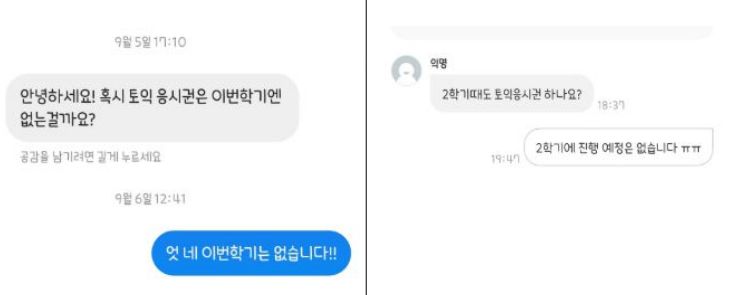 '약속상점' 내 YBM과의 콜라보 상품의 인기는 정말 뜨겁습니다. '약속상점' 하면 "아~ 토익 응시권 받을 수 있는 곳?" 이라는 말이 들릴 정도였어요. 이벤트 공지글을 게시할 때면 담당자인 제 전화기에 불이 나기도 하고, YBM 상품과 관련된 약속을 신청하려고 상점 오픈 시간에 맞춰 '오픈런'하는 상황도 목격했죠. 이벤트 종료 후에도 약속하는 위원회 SNS를 통한 문의가 있을 만큼 인기는 상당합니다. 향후에도 YBM 이벤트를 진행할 수 있다면 정말 좋을 것 같습니다. :D