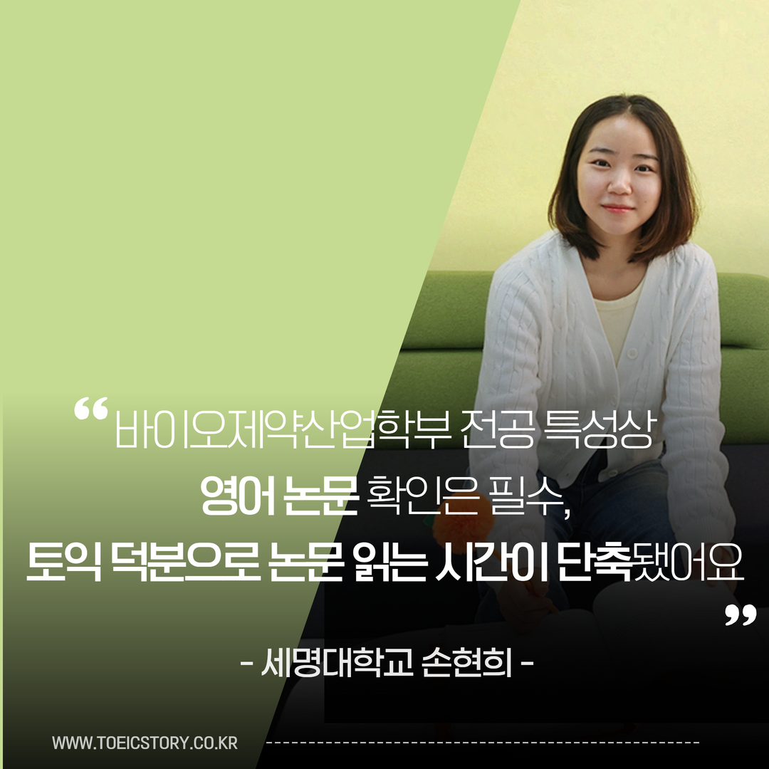 지키기 가장 어렵다는 나와의 약속! 그 약속을 달성하여 토익 응시권을 제공받고, 토익을 응시한 주인공을 모셨습니다. 바로 세명대학교 바이오제약산업학부 4학년 손현희 님인데요. 현재 졸업을 앞두고 대학원 진학을 위해 정진 중이라고 합니다. 바이오제약산업학부는 어떤 학과인지부터 토익 응시 경험까지! 손현희 님의 토익스토리를 함께 들어보실까요? :D