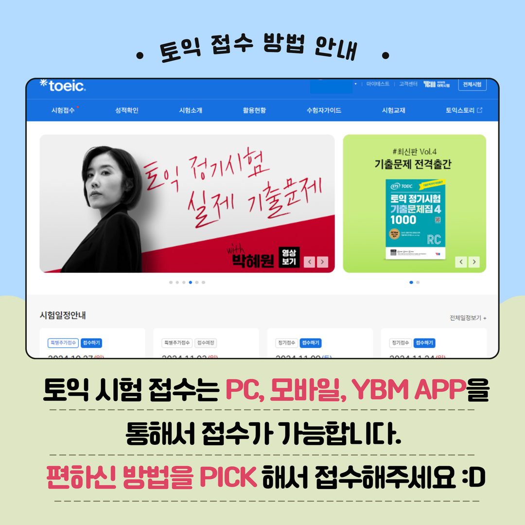 토익 시험에 접수하려면 세 가지 방법이 있는데요. PC, 모바일, YBM APP을 통해서 접수가 가능합니다. 수험자 여러분이 편하신 방법을 PICK! 해서 접수해주세요. :)