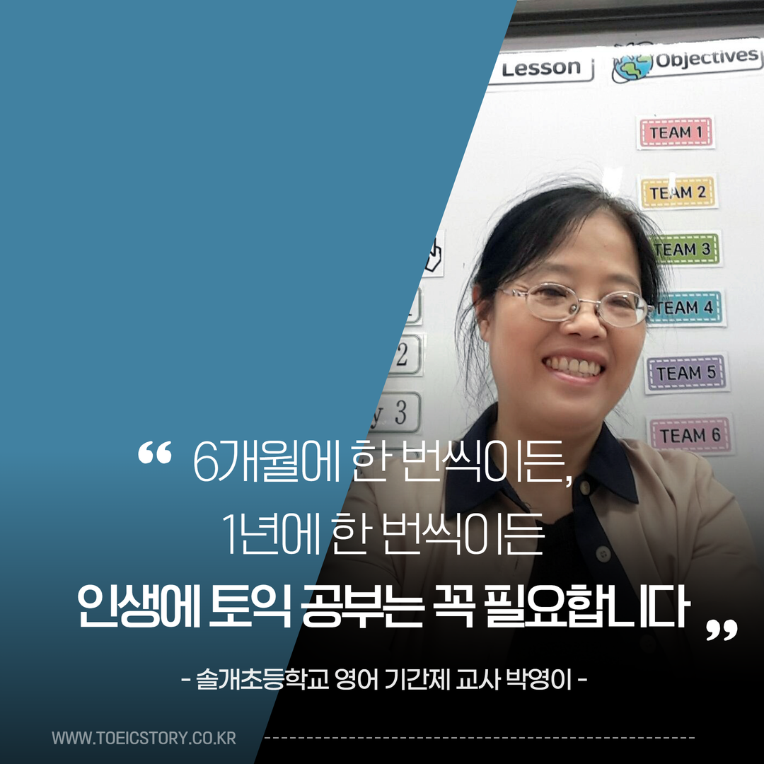 안녕하세요. 용인 솔개초등학교에서 영어 기간제 교사로 학생들을 가르치고 있는 박영이입니다. 나이는 벌써 50대 후반을 달리고 있네요. 토익과의 인연은 1990년대까지 거슬러 올라가는데요. 오늘은 그 이야기를 들려드리고자 <토익스토리> 인터뷰이에 지원했습니다.