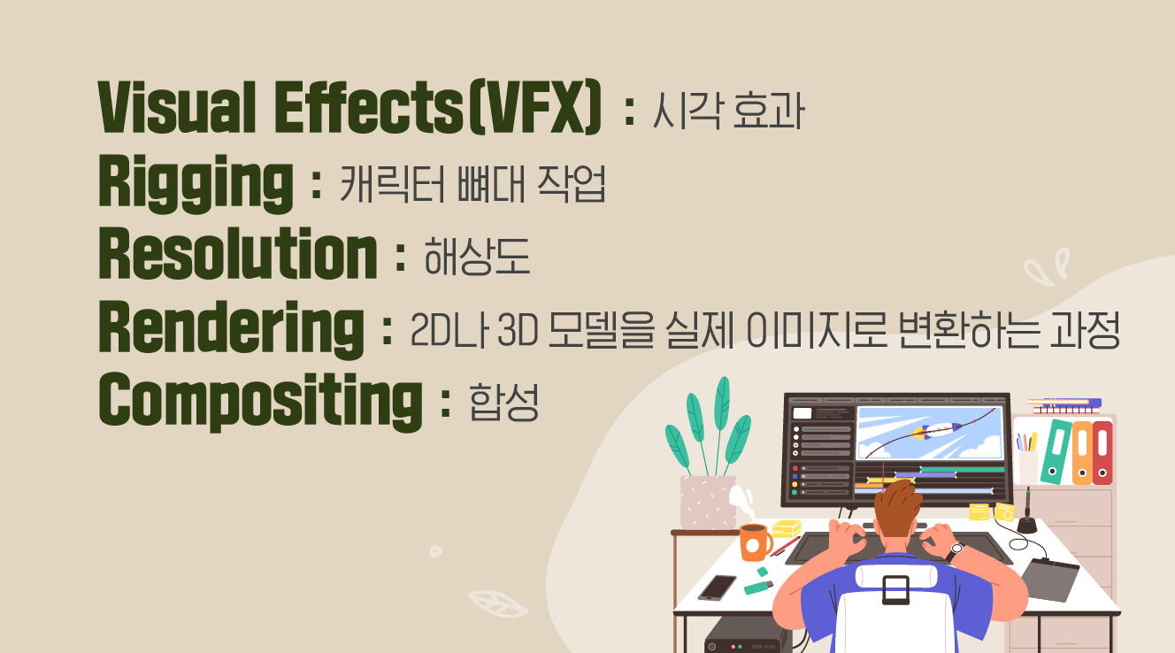 2D나 3D 모델을 실제 이미지로 변환하는 과정인 ‘Rendering’과 캐릭터와 배경, 효과 등을 하나의 완성된 장면으로 조화롭게 결합하는 ‘Compositing(합성)’도 애니메이션의 대표적인 제작 기술이죠!