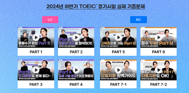 그 옆의 '회차별 문제보기' 카테고리를 눌러보세요! 토익위원회가 여러분을 위해 제대로 떠먹여 드려요 🥄 회차별로 지난 해설 영상들이 준비되어 있습니다.