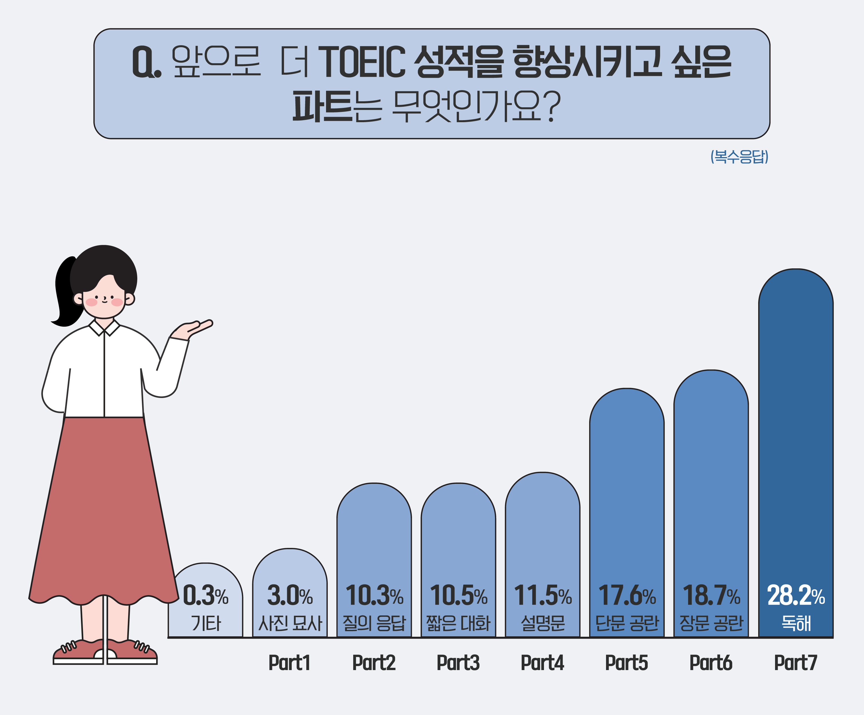 앞으로 성적을 더 향상시키고 싶은 TOEIC 파트로는 28.2%의 응답자가 ‘Part 7 (독해)’을 꼽았습니다. 다음으로 18.7%가 ‘Part 6 (장문 공란)’, 17.6%가 ‘Part 5 (단문 공란)’를 선택했습니다. 이어 ‘Part 4 (설명문)’ 11.5%, ‘Part 3 (짧은 대화)’와 ‘Part 2 (질의 응답)’는 각각 10.5%, 10.3%로 비슷한 비율을 보였습니다. 한편, ‘Part 1 (사진 묘사)’과 ‘기타’는 각각 3%, 0.3%로 나타났습니다.