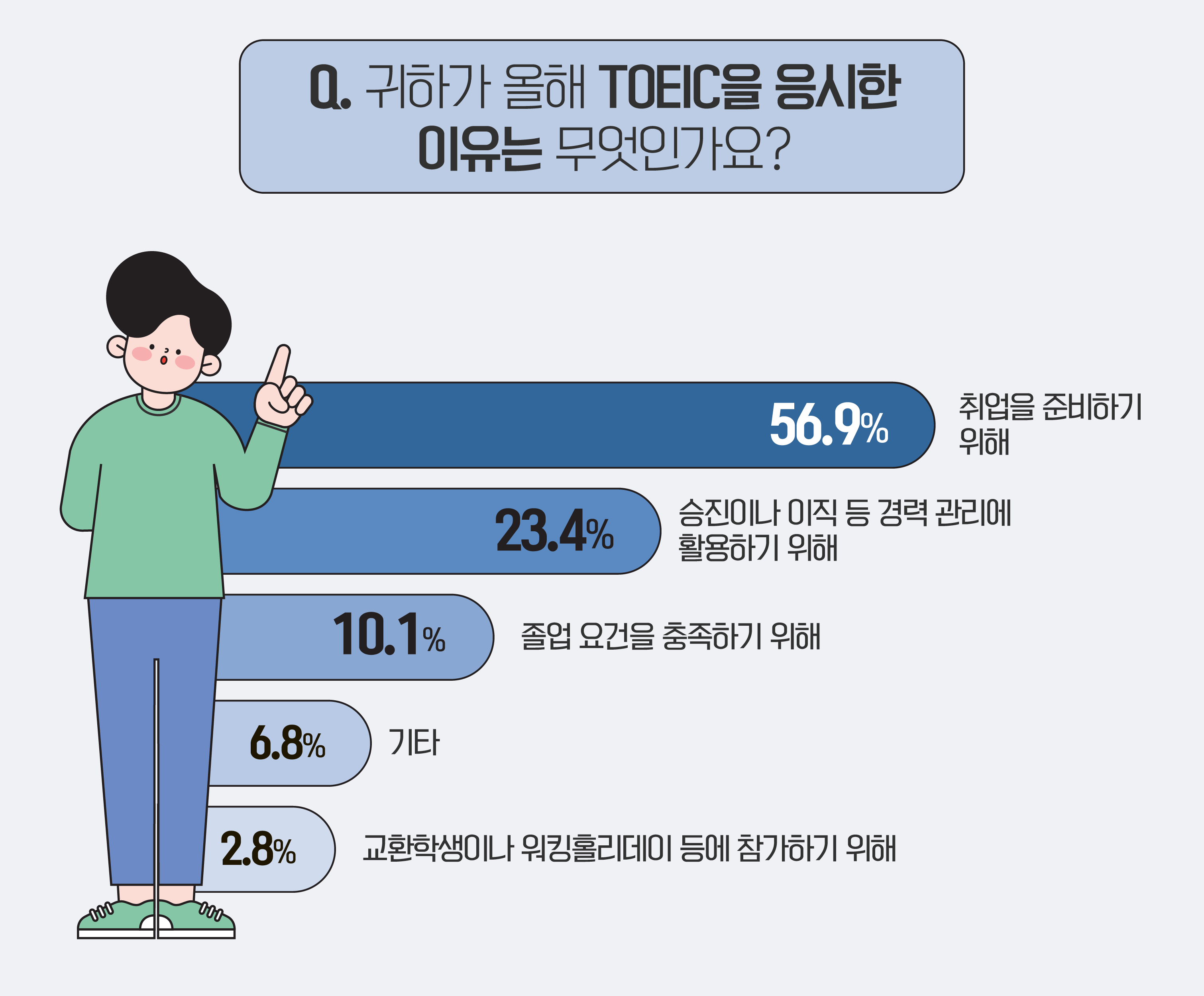 그렇다면, TOEIC 응시 경험이 있는 설문 응답자들이 시험에 응시한 이유는 무엇일까요? 전체의 56.9%가 ‘취업을 준비하기 위해’ 시험에 응시했다고 답했습니다. 이는 많은 사람들이 취업을 준비하면서 어학 능력 향상에 관심을 가지고 있음을 나타내죠!