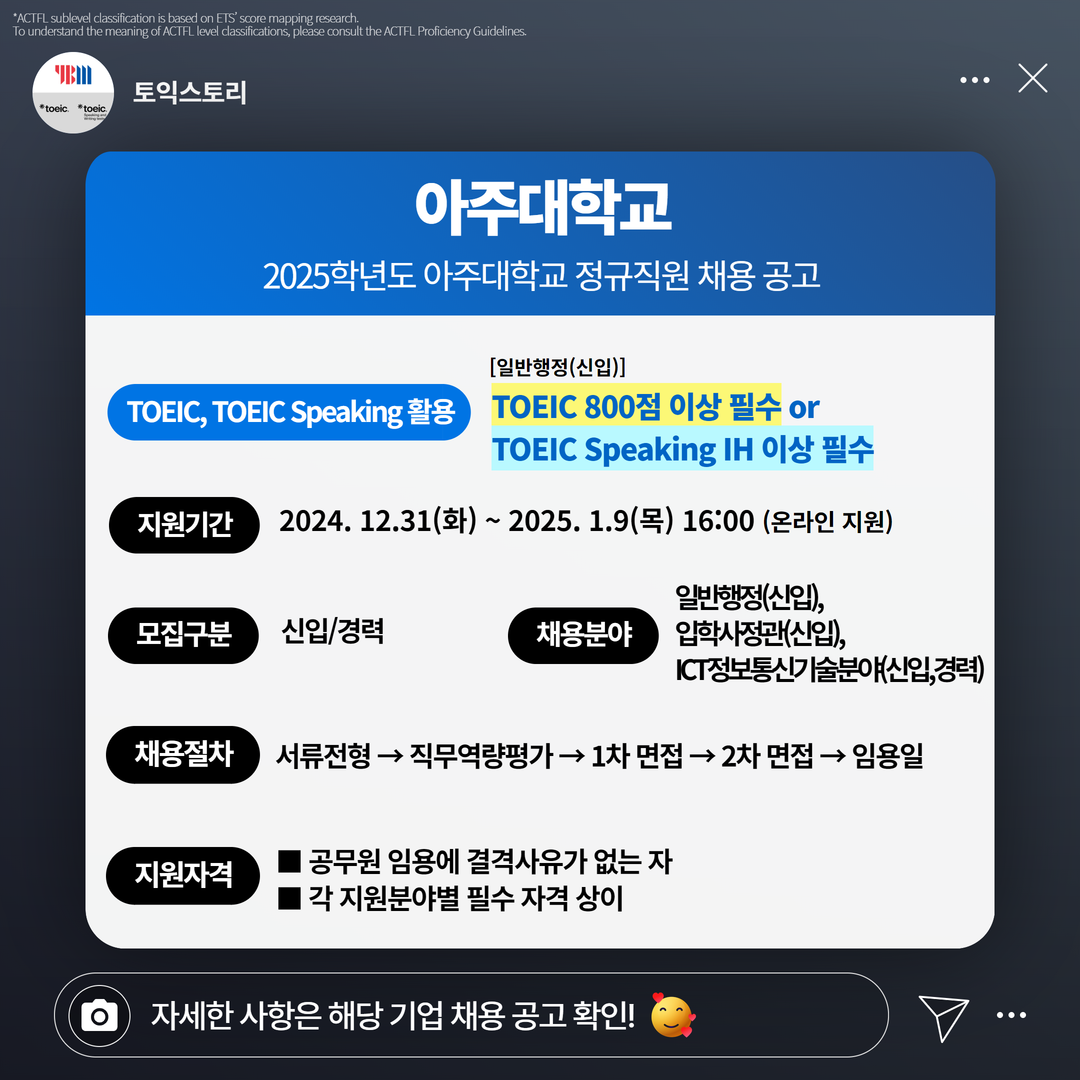 | 아주대학교 | 신입/경력 | 2025학년도 아주대학교 정규직원 채용 공고 | 1.9(목) 16:00 | [일반행정(신입)] TOEIC 800점 이상 필수 or TOEIC Speaking IH 이상 필수 |