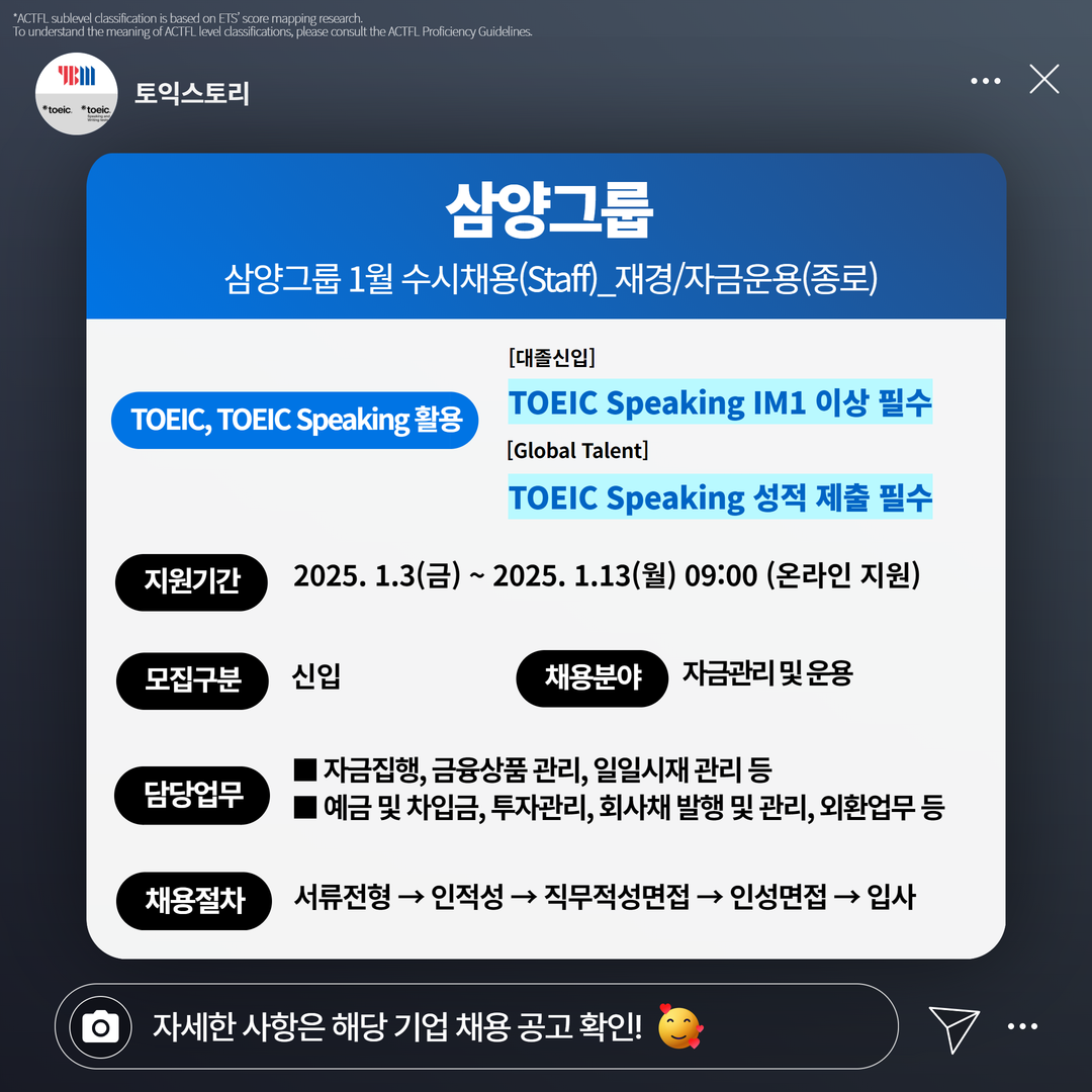 | 삼양그룹 | 신입 | 삼양그룹 1월 수시채용(Staff)_재경/자금운용(종로) | 1.13(월) 09:00 | [대졸신입] TOEIC Speaking IM1 이상 필수 [Global Talent] TOEIC Speaking 성적 제출 필수 |