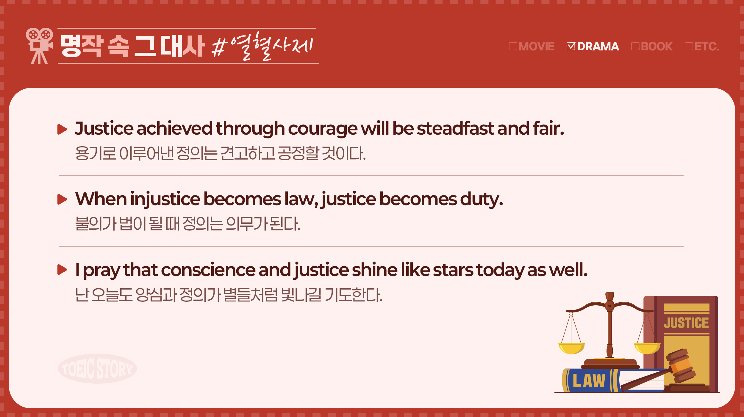 처음 만나볼 <열혈사제> 속 명대사는 "Justice achieved through courage will be steadfast and fair"입니다. 이는 “용기로 이루어진 정의는 견고하고 공정하다”는 의미를 담고 있는데요. 이 대사는 정의가 용기를 통해 실현될 때 얼마나 단단하고 공정한지 강조하며, 미래 시제인 ‘will be’를 사용해 정의가 앞으로도 변치 않을 것임을 암시하죠. 여기서 ‘steadfast’는 ‘견고한’, ‘fair’는 ‘공정한’을 의미하는데요. 특히 ‘Fair Play’에서 사용되는 ‘Fair’도 같은 뜻으로, 스포츠에서 공정성을 상징하는 표현으로 자주 활용되곤 합니다!