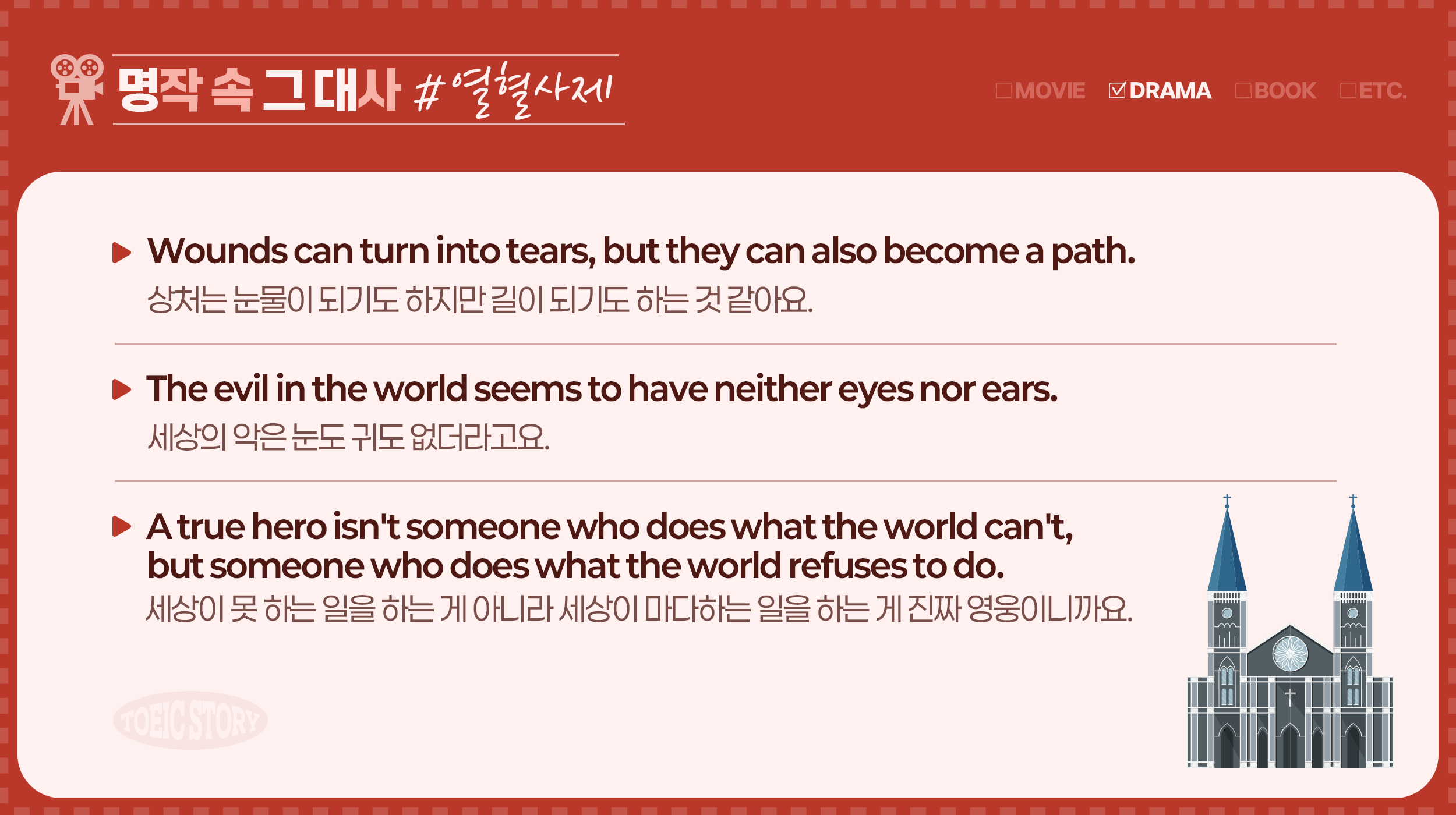 영화, 드라마, 소설 등 다양한 명작들 속에는 시대를 초월하여 우리의 마음을 울리고 깊은 공감을 이끌어내는 명대사들이 숨어 있습니다. 이 대사들은 단순한 대화를 넘어 작품의 주제와 메시지를 담아내고, 때로는 인생의 교훈을 전해주기도 하는데요. <토익스토리>의 신규 콘텐츠 ‘명작 속 그 대사(명그대)’는 명작에서 나온 대사들을 통해 영어 표현을 배우는 코너입니다. 영어 학습은 물론, 작품의 감동과 배경 지식까지 함께 즐길 수 있는 명그대에서 새롭고 흥미로운 이야기를 만나보세요! :)