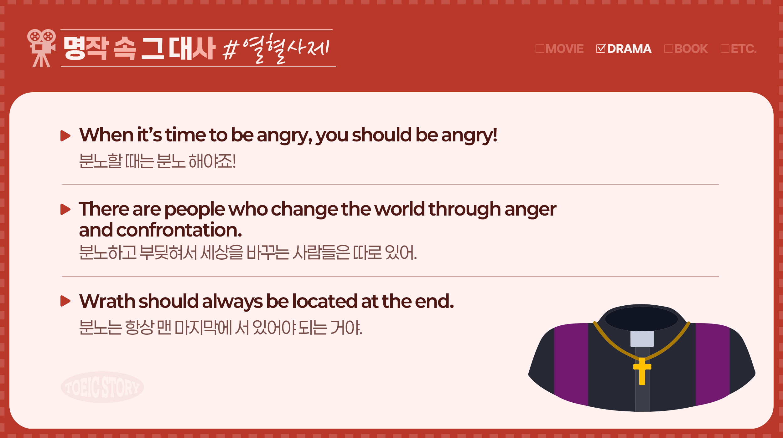 분노는 흔히 부정적인 감정으로 여겨지지만, 정의와 결합될 때 세상을 변화시키는 강력한 원동력이 되기도 합니다. <열혈사제> 속 분노와 관련된 첫 번째 명대사는 주인공 김해일 신부님이 얘기한 "When it’s time to be angry, you should be angry!(분노할 때는 분노 해야죠!)"입니다. 이 문장은 시간 부사절 ‘When’을 사용해 특정 시점과 상황의 중요성을 강조하는데요. 이어지는 ‘You should be angry’에서는 조동사 ‘should’를 통해 분노해야 할 상황에서는 반드시 그 감정을 표현해야 한다는 점을 강하게 전달하고 있습니다.