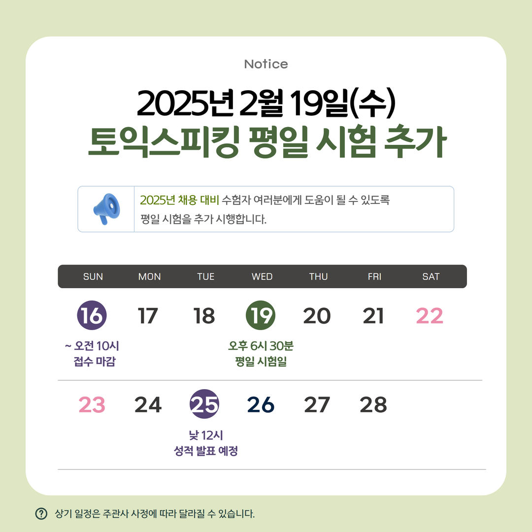 | 2025년 4월 토익스피킹 평일 시험 추가 안내 (0) | 2025.04.07 |