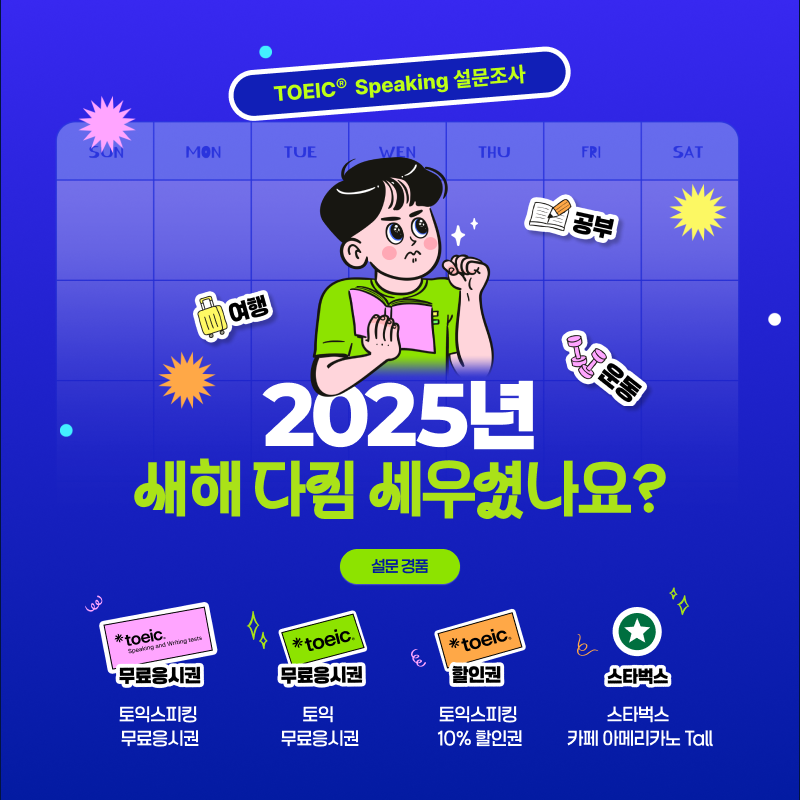 | 2025년 1월 토익스피킹 평일 시험 추가 안내 ☃️ 새해엔 토스보자! (0) | 2025.01.06 |