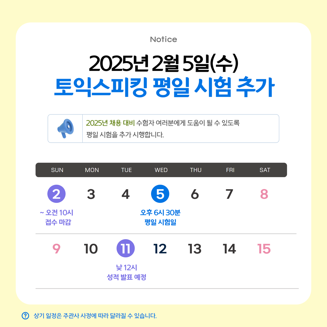 2025년 3월 토익스피킹 평일 시험 추가 안내 - 3월은 매주 수요일마다 있어요! (0) | 2025.02.17 |