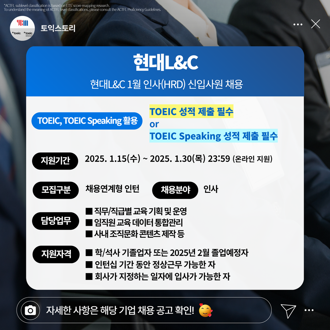 | 현대L&C | 인턴 | 현대L&C 인사(HRD) 신입사원 채용 | 1.30(목) 23:59 | TOEIC 성적 제출 필수 or TOEIC Speaking 성적 제출 필수 |