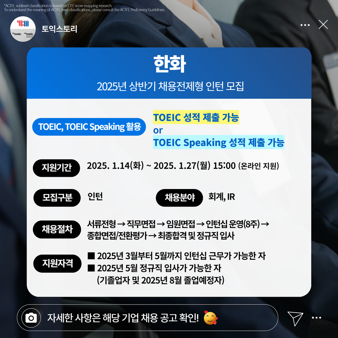 | 한화 | 인턴 | 2025년 상반기 채용전제형 인턴 모집 | 1.27(월) 15:00 | TOEIC 성적 제출 가능 or TOEIC Speaking 성적 제출 가능 |
