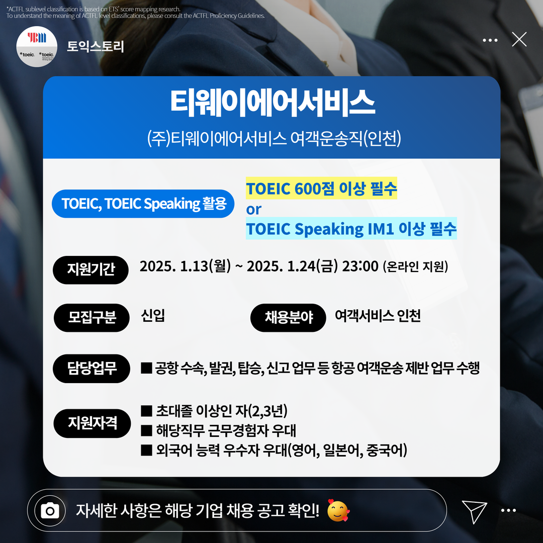 | 티웨이에어서비스 | 신입 | (주)티웨이에어서비스 여객운송직(인천) | 1.24(금) 23:00 | TOEIC 600점 이상 필수 or TOEIC Speaking IM1 이상 필수 |