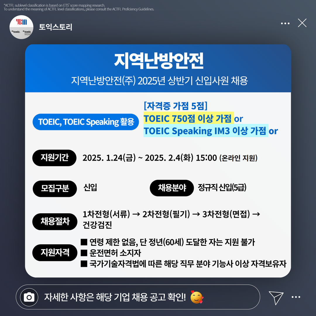 | 지역난방안전 | 신입 | 지역난방안전(주) 2025년 상반기 신입사원 채용 | 2.4(화) 15:00 | [자격증 가점 5점] TOEIC 750점 이상 가점 or TOEIC Speaking IM3 이상 가점 |