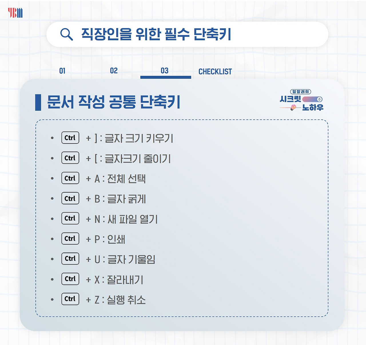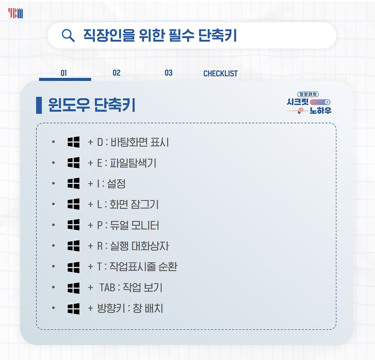 📢 업무 속도를 높이고 효율성을 극대화할 수 있는 간단한 방법, 바로 '단축키' 활용입니다. 평소 마우스를 여러 번 클릭하며 작업했던 것들이 단축키로 순식간에 해결된다면 얼마나 편리할까요? 오늘은 직장인이라면 꼭 알아야 할 윈도우, 크롬, 문서 작업에 유용한 단축키들을 소개해드립니다. 더불어, 생산성을 높이는 데 도움을 줄 체크리스트도 함께 준비했으니, 이 콘텐츠를 통해 진정한 일잘러로 거듭나 보세요!