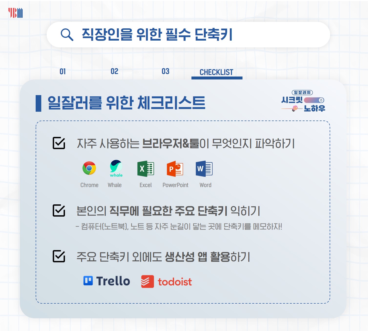 업무 효율성을 높이기 위해 필요한 첫걸음은 자신만의 업무 스타일을 점검하고 최적화하는 것이죠! 이를 위해 간단한 체크리스트를 활용하면 효과적인 업무 환경을 구축할 수 있는데요. 먼저, 크롬, 웨일, 엑셀 등과 같이 자주 사용하는 브라우저와 툴이 무엇인지 파악해 보시기 바랍니다.