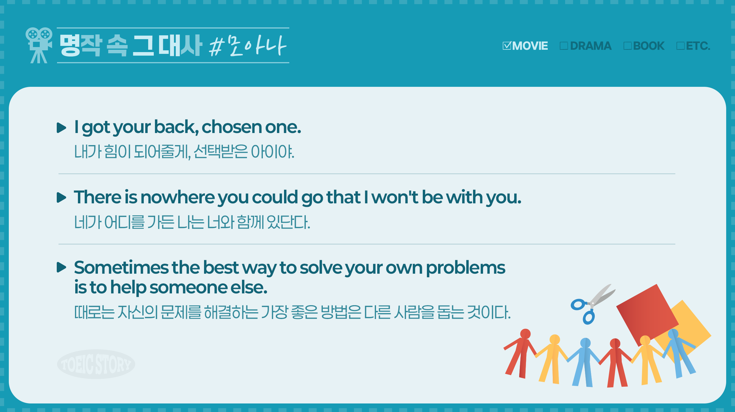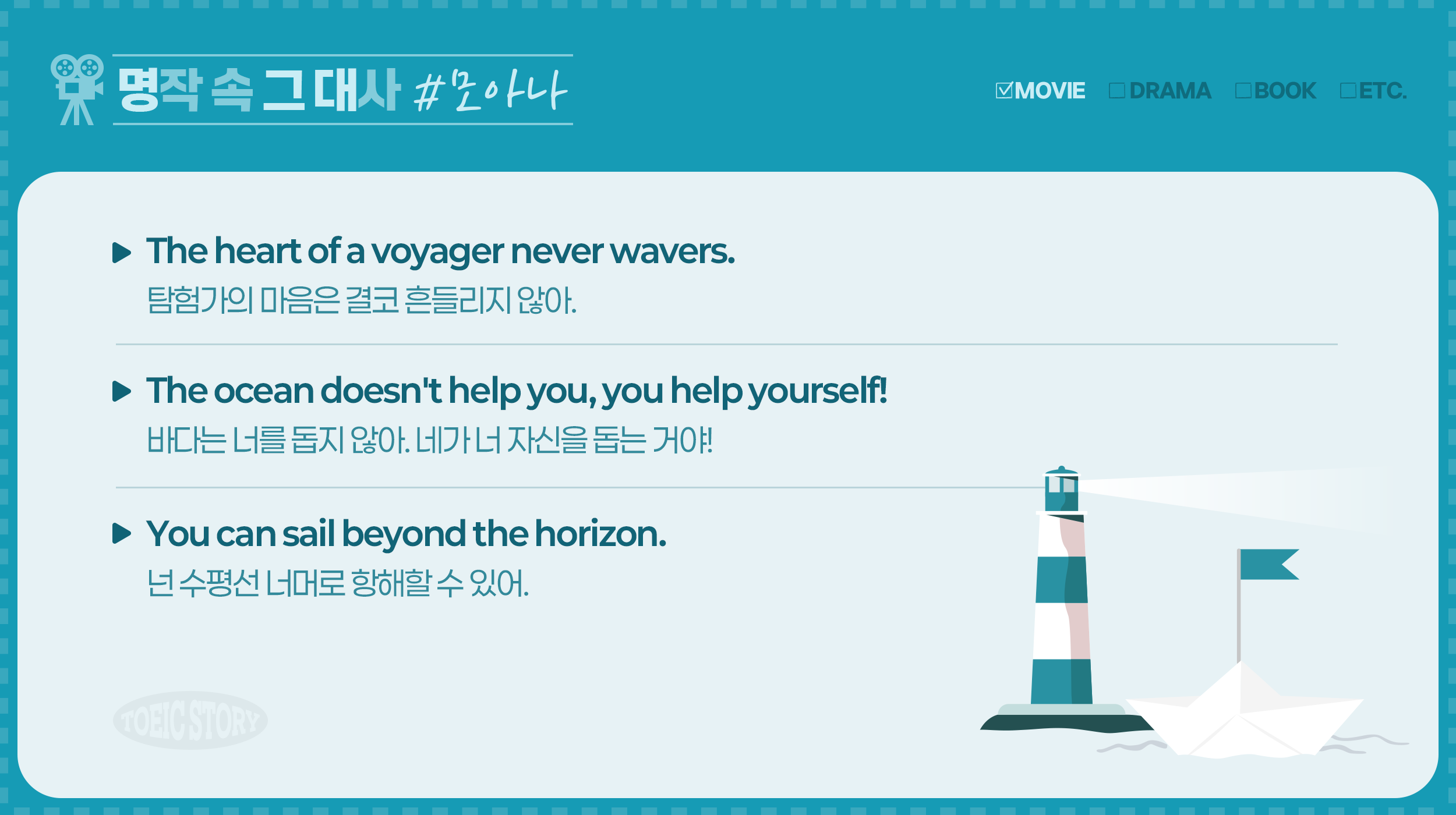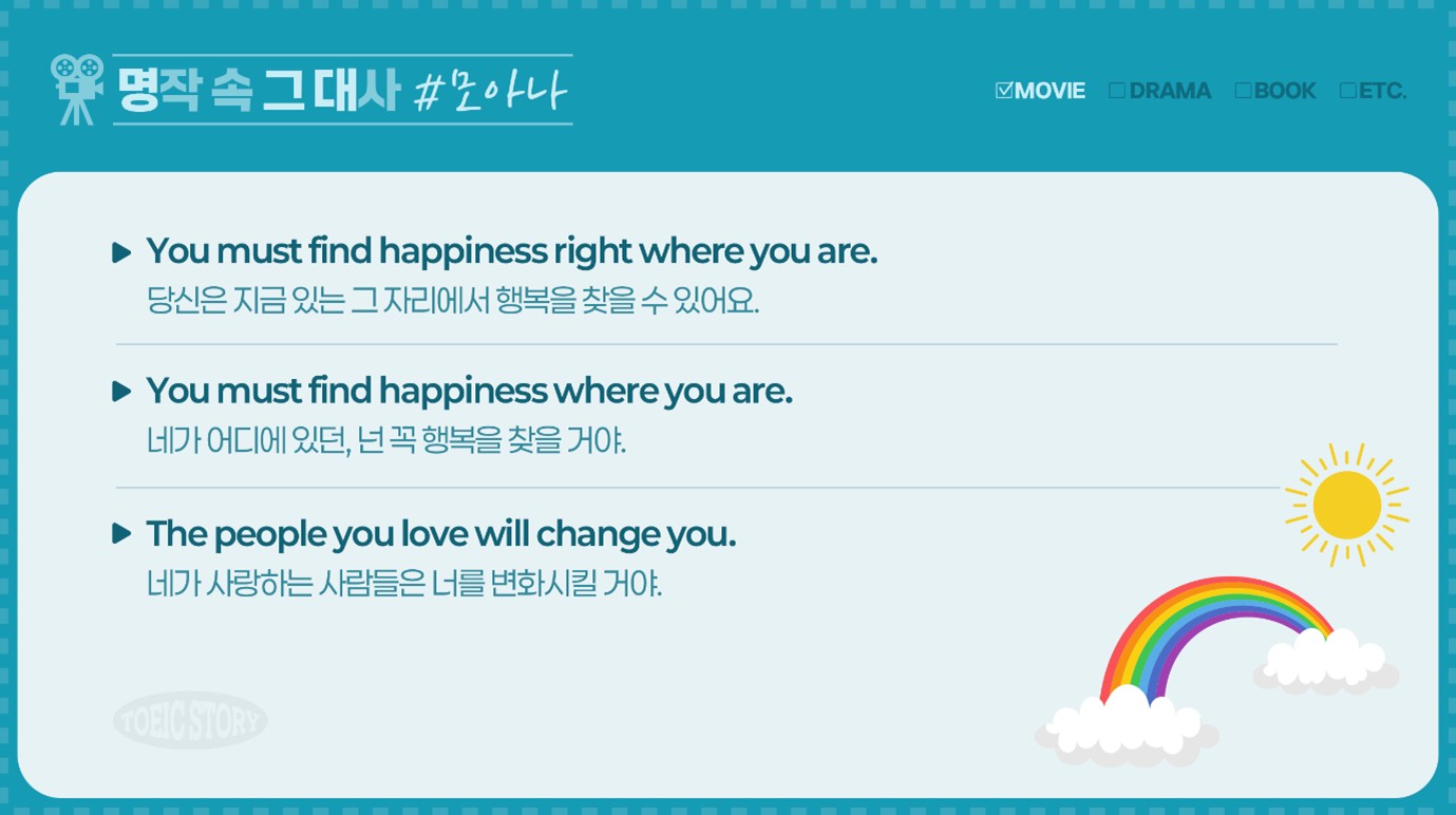 영화, 드라마, 소설 등 다양한 명작들 속에는 시대를 초월하여 우리의 마음을 울리고 깊은 공감을 이끌어내는 명대사들이 숨어 있습니다. 이 대사들은 단순한 대화를 넘어 작품의 주제와 메시지를 담아내고, 때로는 인생의 교훈을 전해주기도 하는데요. <토익스토리>의 신규 콘텐츠 ‘명작 속 그 대사(명그대)’는 명작에서 나온 대사들을 통해 영어 표현을 배우는 코너입니다. 영어 학습은 물론, 작품의 감동과 배경 지식까지 함께 즐길 수 있는 명그대에서 새롭고 흥미로운 이야기를 만나보세요! :)