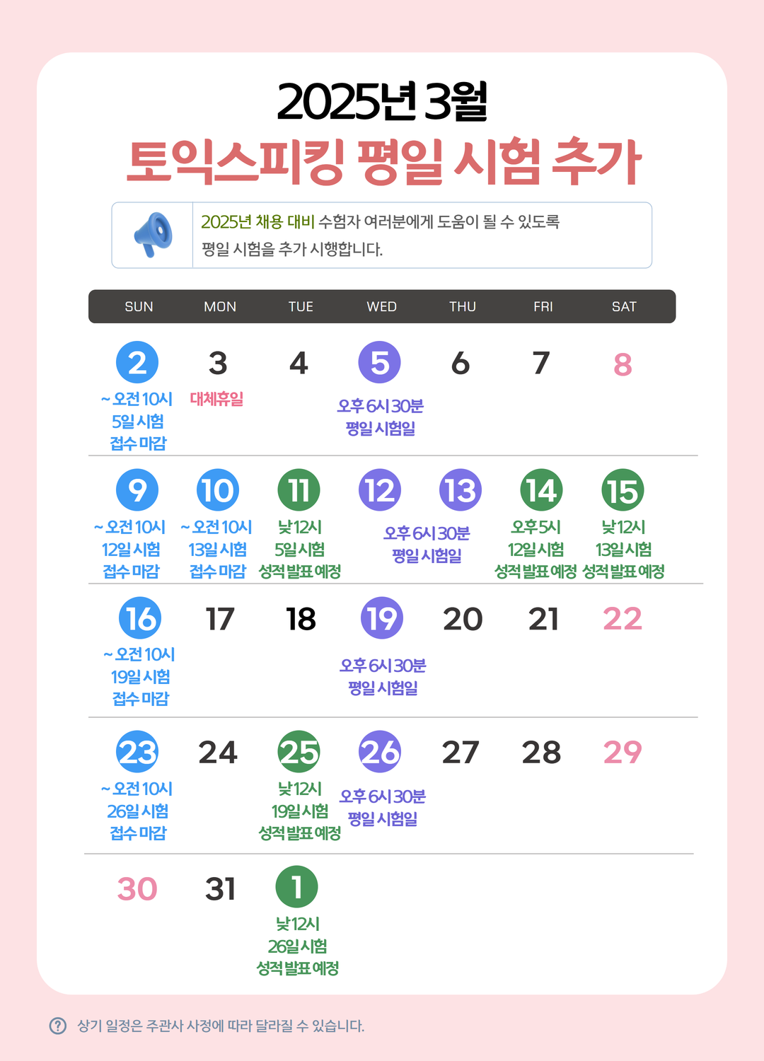 토익스피킹 2025년 3월 평일 시험 추가 안내