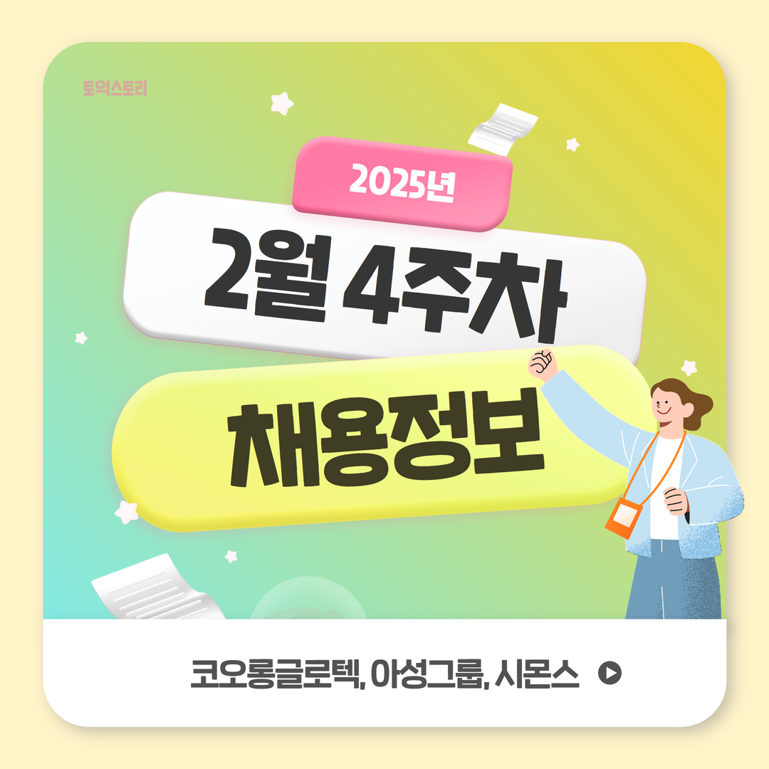 <토익스토리>가 코오롱글로텍, 아성그룹, 시몬스 채용 정보를 안내해 드립니다. 모집 마감일과 토익, 토익스피킹 성적 기준을 확인해 보세요!