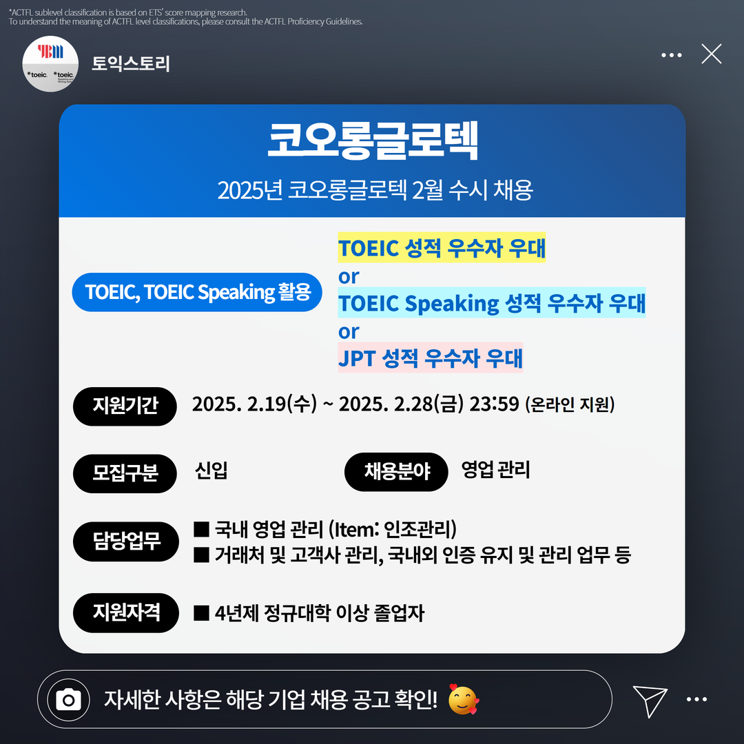 | 코오롱글로텍 | 신입 | 2025년 코오롱그룹 2월 정기공채 | 2.28(금) 23:59 | TOEIC 성적 우수자 우대 or TOEIC Speaking 성적 우수자 우대 or JPT 성적 우수자 우대 |