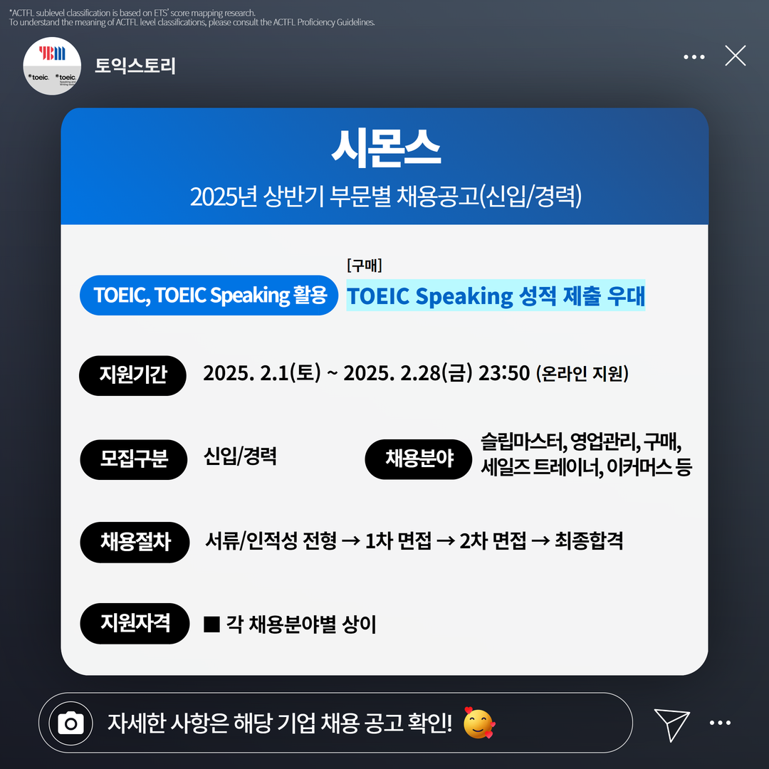 | 시몬스 | 신입/경력 | 2025년 상반기 부문별 채용공고 | 2.28(금) 23:50 | [구매] TOEIC Speaking 성적 제출 우대 |