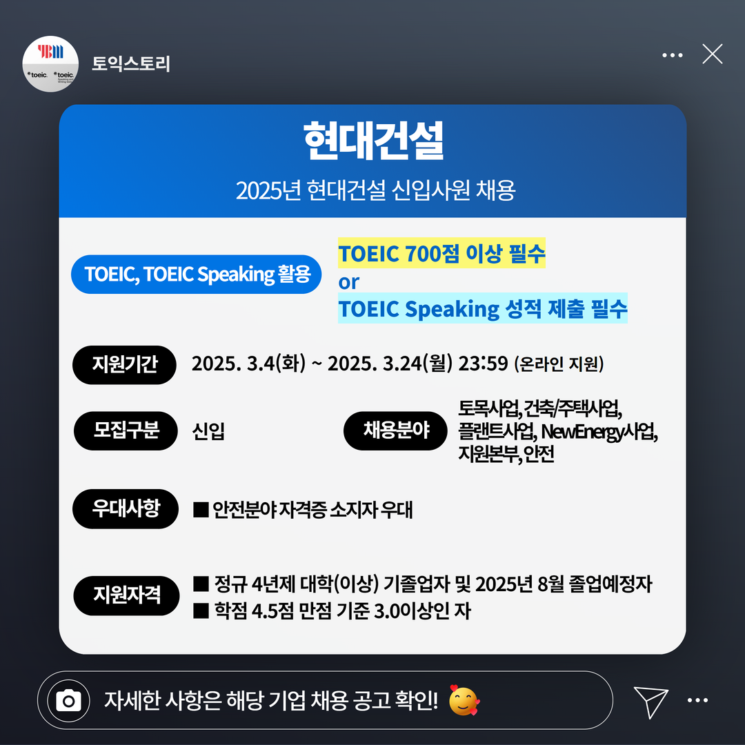 | 현대건설 | 신입 | 2025년 현대건설 신입사원 채용 | 3.24(월) 23:59 | TOEIC 700점 이상 필수 or TOEIC Speaking 성적 제출 필수 |