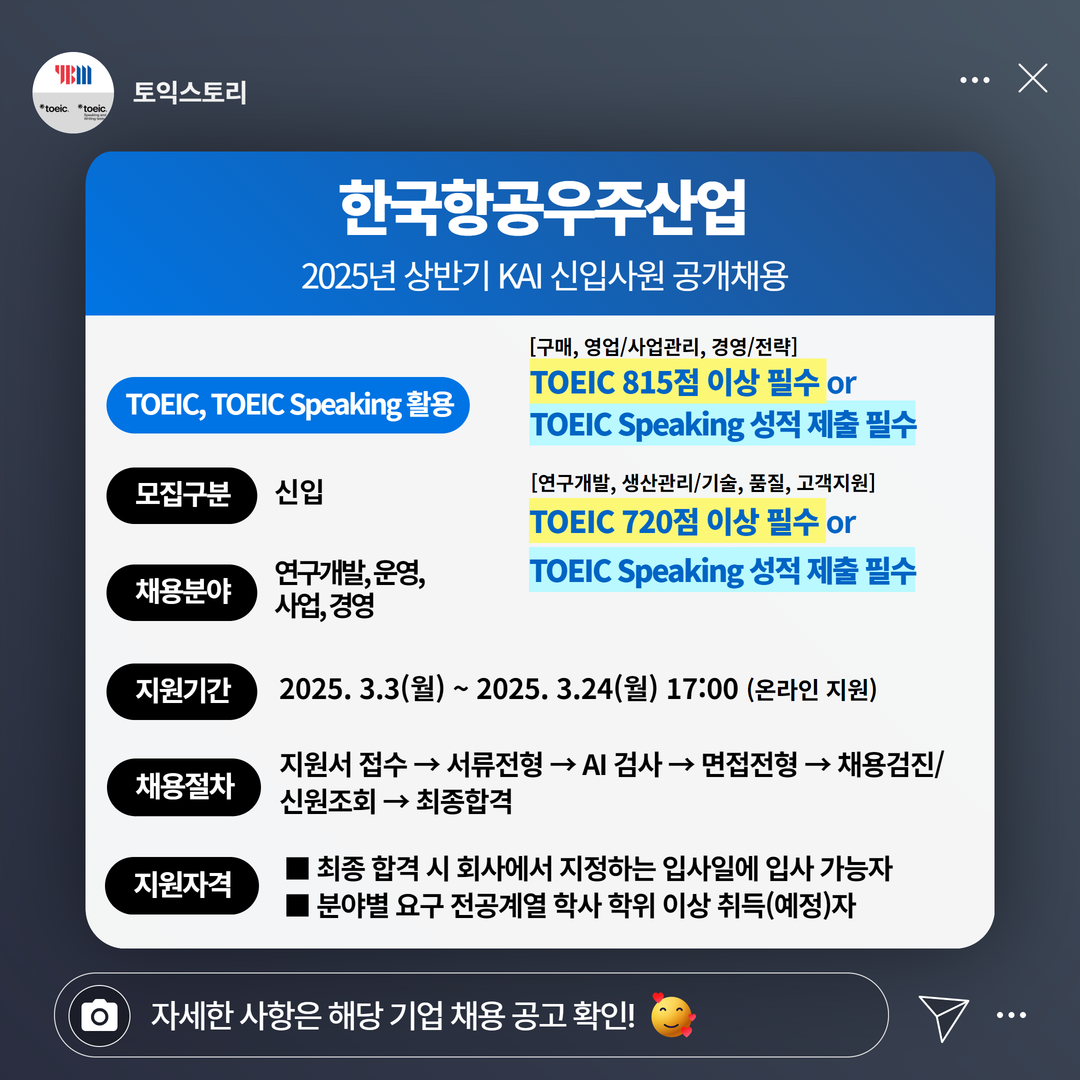| 한국항공우주산업 | 신입 | 2025년 상반기 한국항공우주산업(KAI) 신입사원 공개채용 | 3.24(월) 17:00 | [구매, 영업/사업관리, 경영/전략] TOEIC 815점 이상 필수 or TOEIC Speaking 성적 제출 필수 [연구개발, 생산관리/기술, 품질, 고객지원] TOEIC 720점 이상 필수 or TOEIC Speaking 성적 제출 필수 |