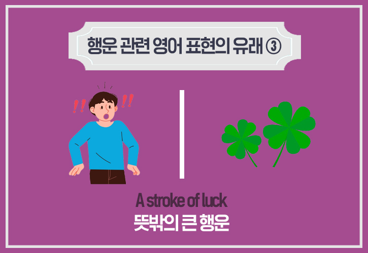 ‘A stroke of luck’은 18세기 말 영국에서 처음 사용된 것으로 알려져 있는데요. 여기서 ‘갑작스러운 사건’을 의미하는 ‘stroke’는 ‘오지 않는다고 생각되는 곳에서의 놀랄 만한 행동’을 의미하는 데서 비롯됐다고 합니다.