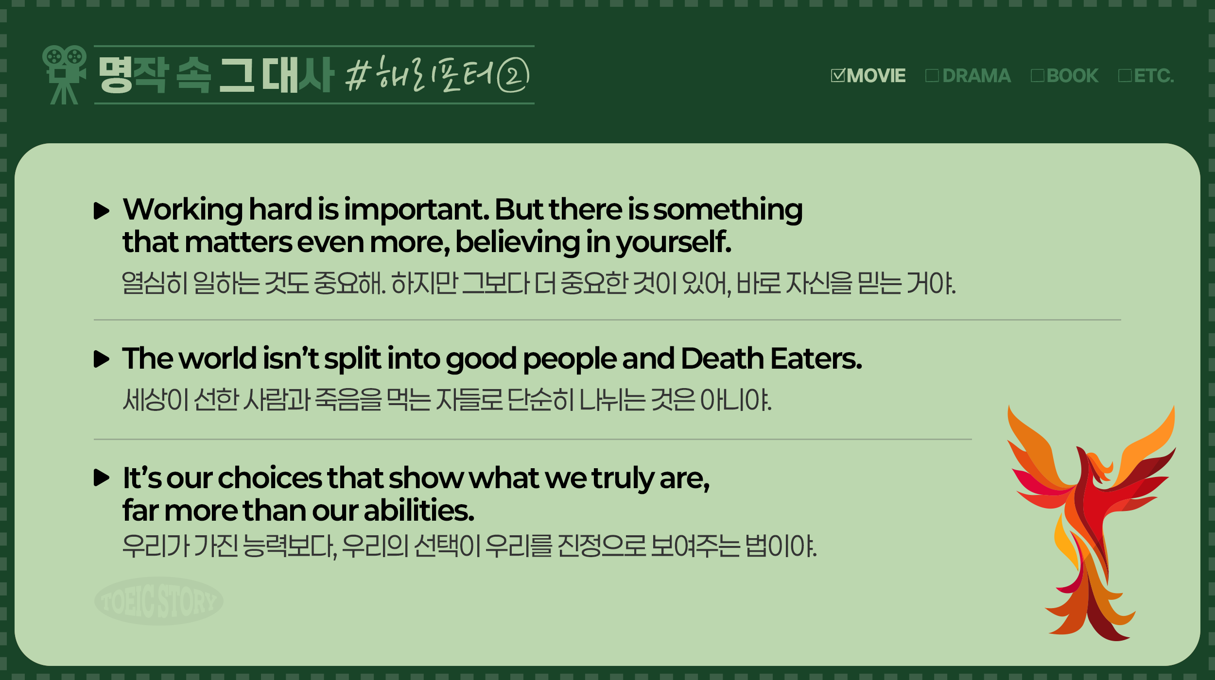 오늘은 영화 <해리포터> 시리즈 속 명대사들을 통해 영어 표현을 배워보았습니다. 호그와트에서 해리와 친구들이 수많은 도전과 시련을 이겨내며 성장해 나갔듯, 여러분도 새로운 도전 앞에서 스스로를 믿고 한 걸음씩 나아가길 바랍니다. <토익스토리>는 언제나 여러분의 여정이 멋진 순간들로 가득하길 응원합니다! :)