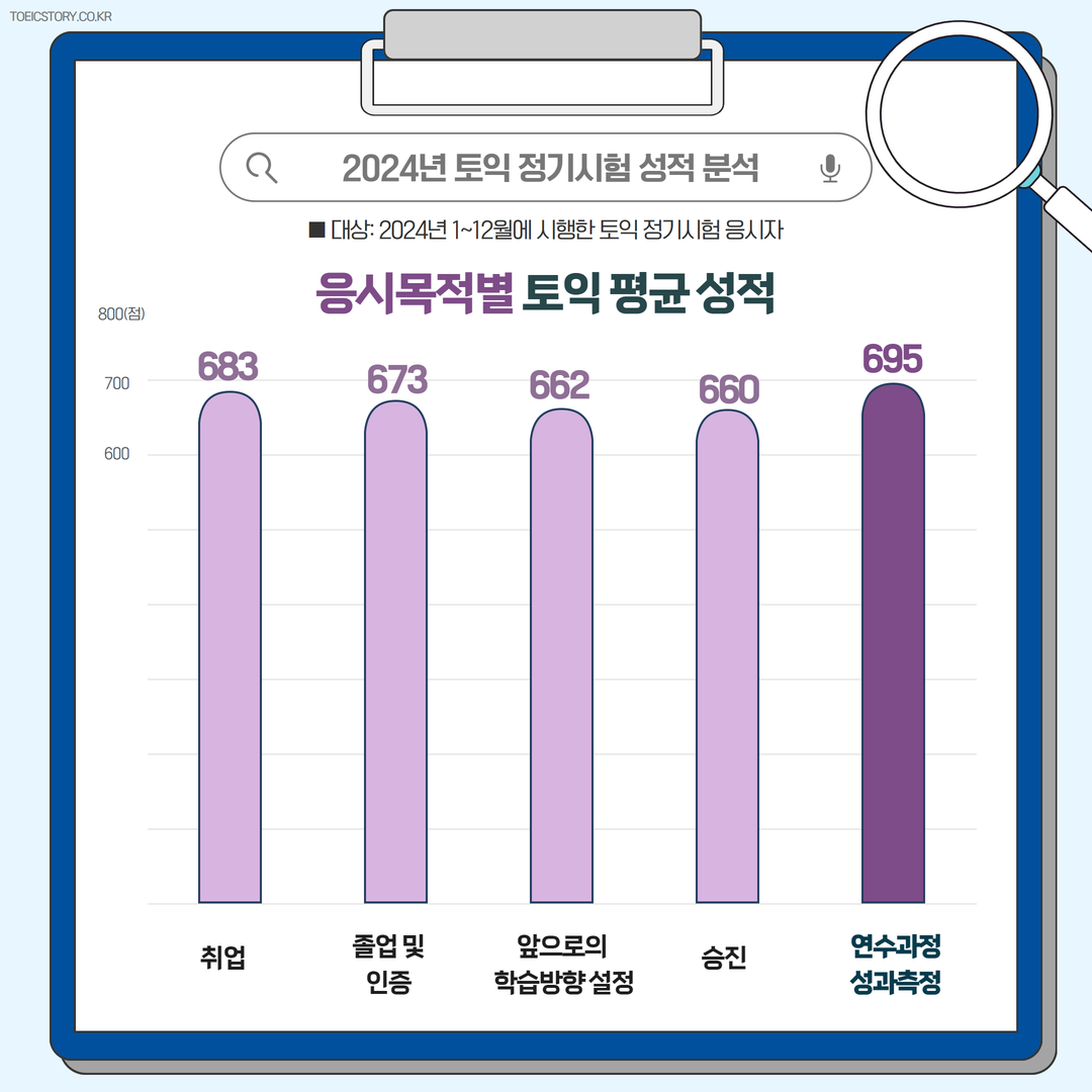그렇다면 응시목적별 토익 평균 성적은 어떠할지 확인한 결과, '연수과정 성과측정'이 695점으로 1위를 차지했습니다. 응시목적별 비율 1위였던 '취업'은 683점으로 2등을 차지했고요.
