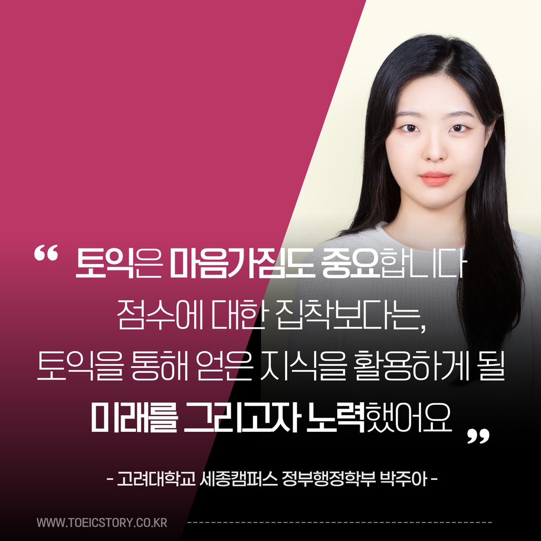 토익으로 편입, 졸업 인증, 장학금, 대외활동 서류합격, 취업 준비까지! 토익의 활용처는 다양하지만, 취득한 성적을 얼마나 알차게 사용하느냐는 개인의 몫입니다. 더불어 목표한 성적을 달성하기 위해 달려가는 과정은 절대 쉽지 않을텐데요. <토익스토리>는 토익 성적을 활용해 이 모든 것을 이뤄낸 고려대학교 세종캠퍼스 박주아 님을 만났습니다.