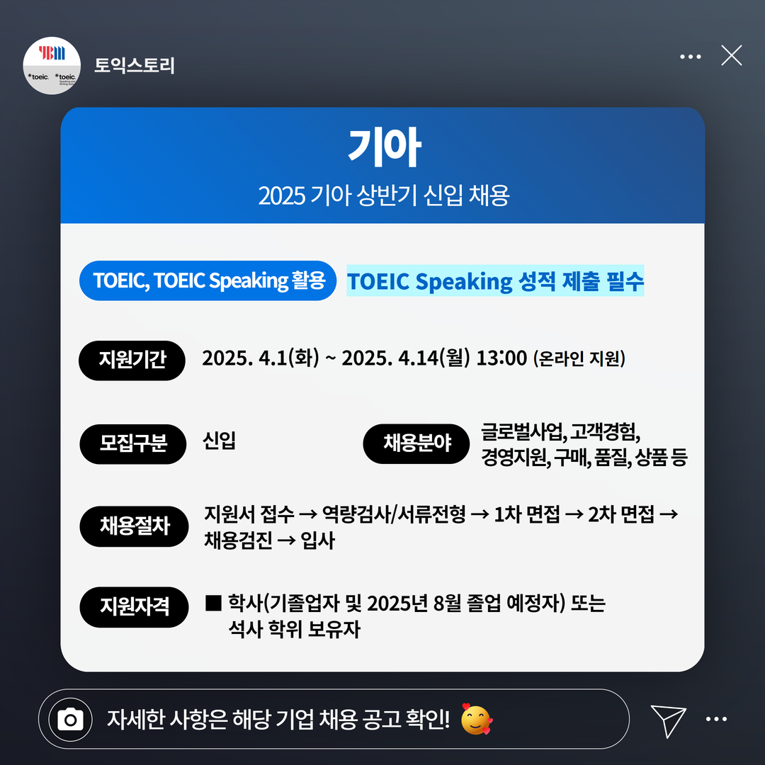 | 기아 | 신입 | 2025 기아 상반기 신입 채용 | 4.14(월) 13:00 | TOEIC Speaking 성적 제출 필수 |