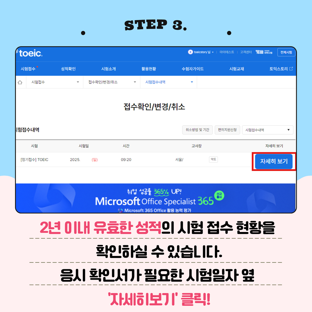 응시확인서가 필요한 시험 일자 옆 파란색 '자세히 보기' 버튼을 클릭해 주세요!