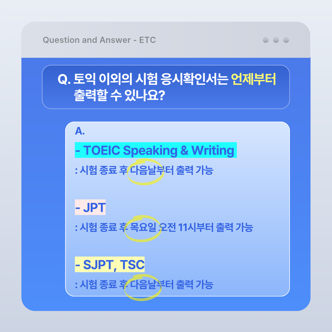 | TOEIC Speaking&Writing | 시험 종료 후 다음날부터 출력 가능 |