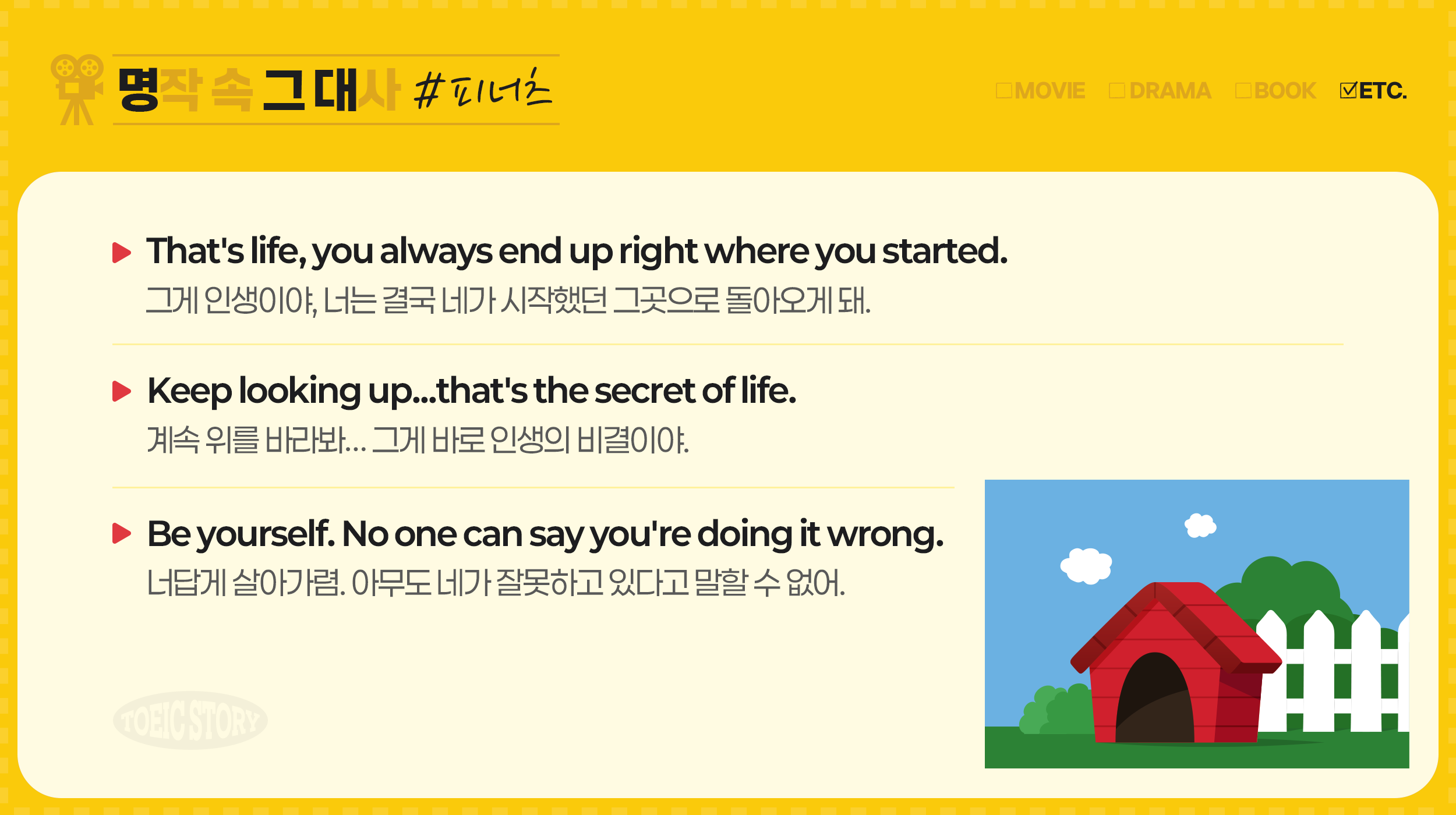 오늘은 <피너츠> 속 따뜻한 명대사들을 통해 영어 표현을 배워보았습니다. 위로와 공감이 필요한 순간에, 짧은 문장 하나가 마음을 어루만져주기도 하죠. 영어 표현을 배울 뿐 아니라 삶의 태도까지 돌아보게 만드는 명작이 아닐까요? <토익스토리>는 언제나 여러분의 행복과 밝게 빛날 인생을 응원하며, 여기서 이만 인사드리겠습니다!