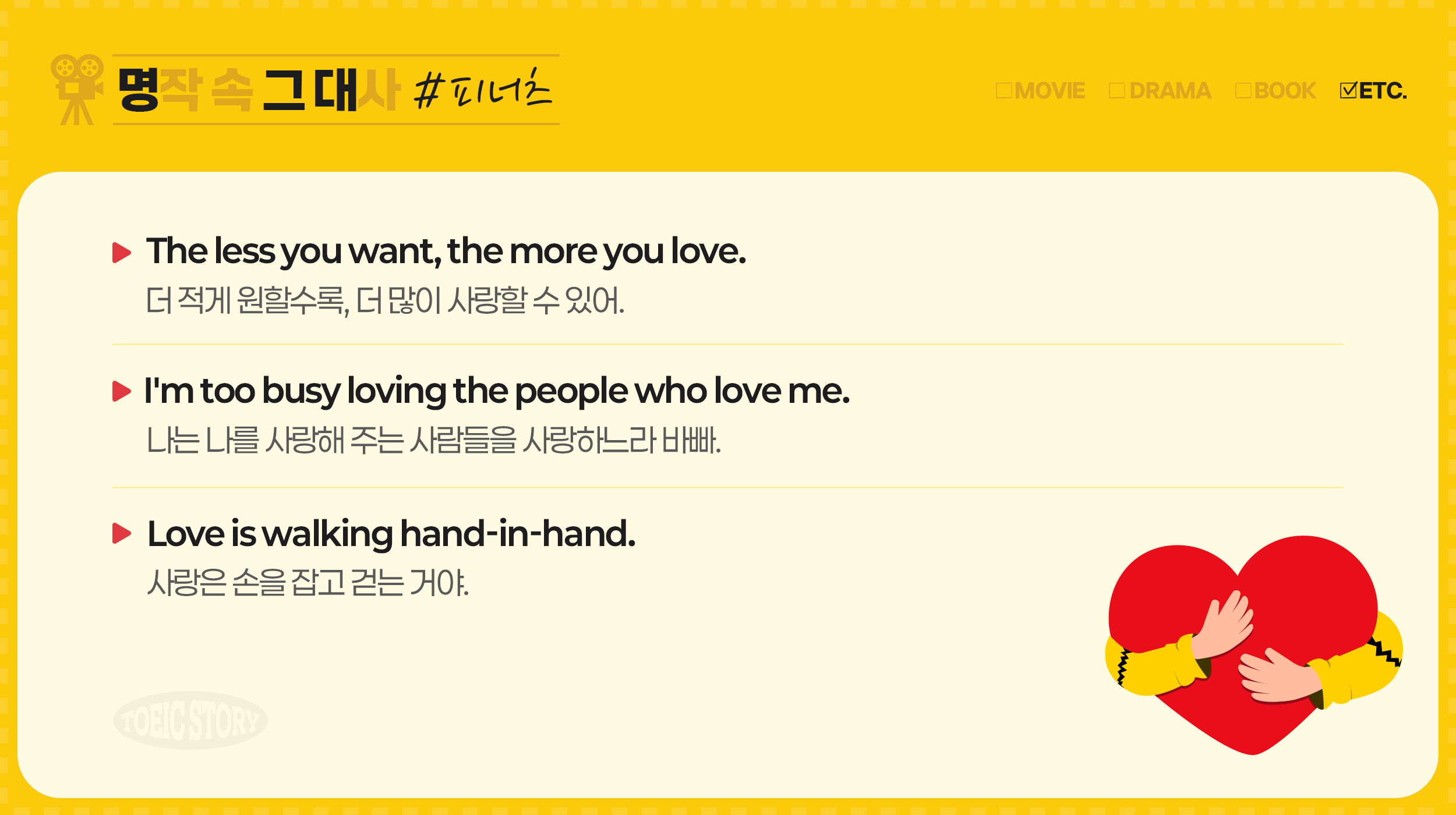 마지막으로 소개할 명대사는 “Love is walking hand-in-hand(사랑은 손을 잡고 걷는 거야.)”입니다. 이 말은 짧지만 강렬하게 사랑의 본질을 표현한 대사로, 거창한 말보다 함께 걷는 그 순간에 사랑이 있다는 메시지를 담고 있는데요. ‘hand-in-hand’는 ‘서로 손 잡은’이라는 뜻으로, 일상에서도 자주 쓰이는 표현입니다. :)
