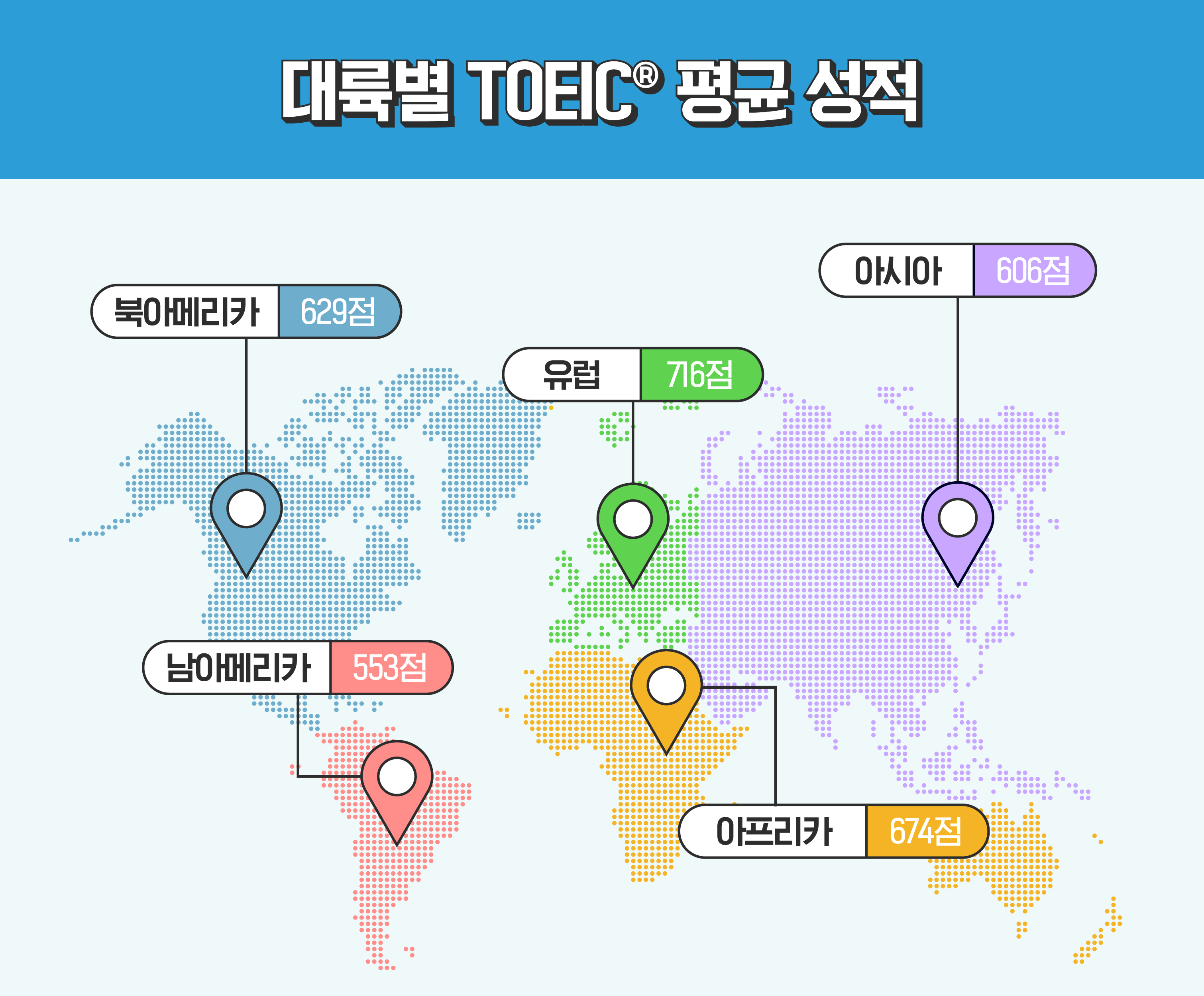 TOEIC은 전 세계에서 영어 의사소통 능력을 평가하기 위해 널리 활용되는 시험 중 하나입니다. 그렇다면, 2024년에는 어느 대륙의 TOEIC 평균 성적이 가장 높았을까요?