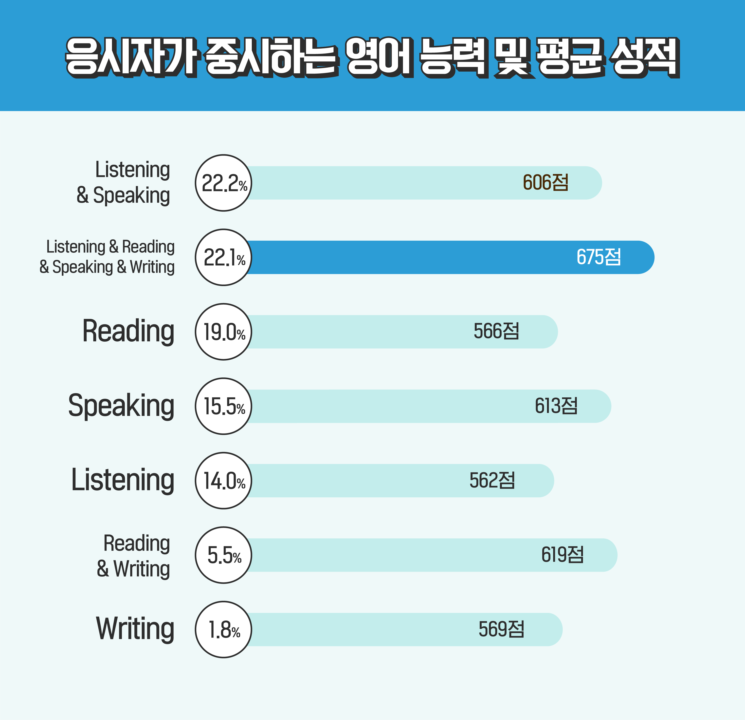 마지막으로, TOEIC 응시자가 중요하게 생각하는 영어 능력에 따라 평균 성적이 어떻게 나타났는지 살펴보겠습니다. ‘듣기 & 말하기(Listening & Speaking)’를 중시한 응답자가 22.2%로 가장 높은 비율을 차지했으며, 평균 성적은 606점으로 집계되었습니다. 뒤를 이어 ‘듣기 & 읽기 & 말하기 & 쓰기(Listening & Reading & Speaking & Writing)’ 네 가지 영역 모두를 중요하게 여긴 응답자(22.1%)가 평균 675점으로 가장 높은 점수를 기록했네요!