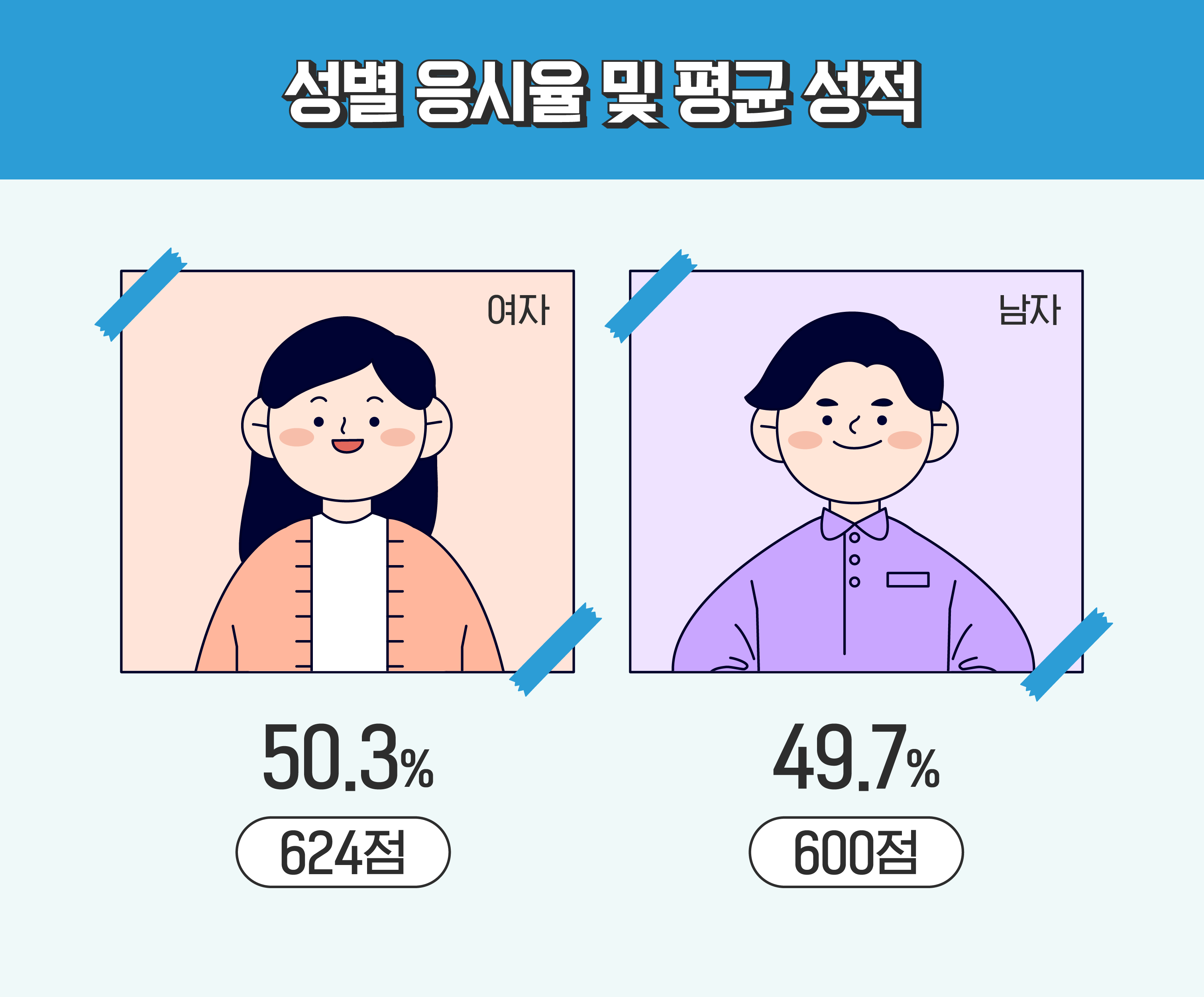 2024년, TOEIC에 응시한 전 세계인의 성별 비율은 어떻게 나타났을까요? ‘여성’ 응시자 비율이 50.3%로 소폭 우세를 보였으며, ‘남성’ 응시자는 49.7%를 기록했습니다. 성별에 따른 평균 성적을 살펴보면, ‘여성’이 평균 624점, ‘남성’이 600점으로 여성 응시자가 24점 더 높은 평균 성적을 기록했네요!