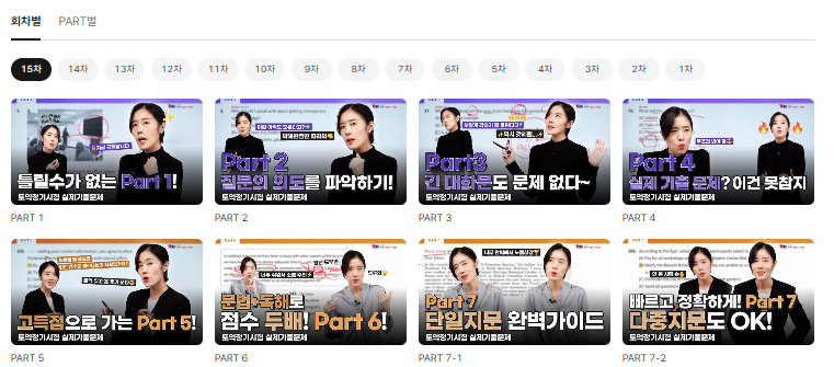 조금 아래로 스크롤을 내리시면 지금까지의 회차별, 파트별 강의를 확인하실 수 있습니다. 이번 16차 실제기출 문제를 모두 학습한 토익커라면 지난 실제기출 문제까지 학습하면 더 좋겠죠?